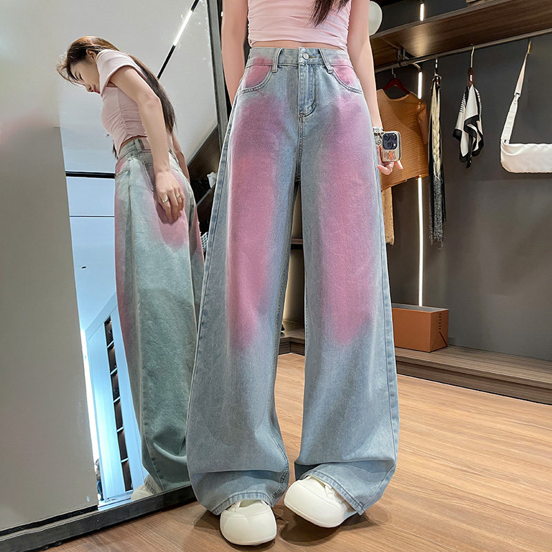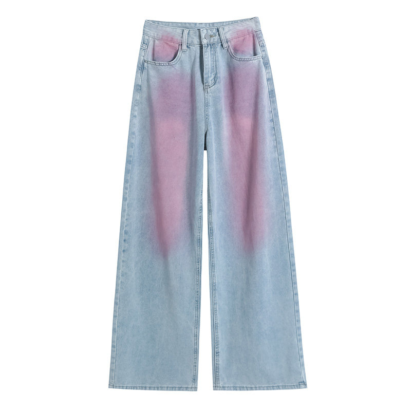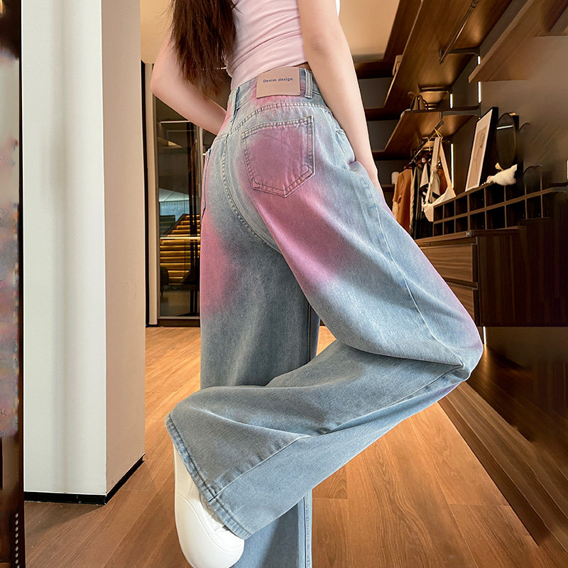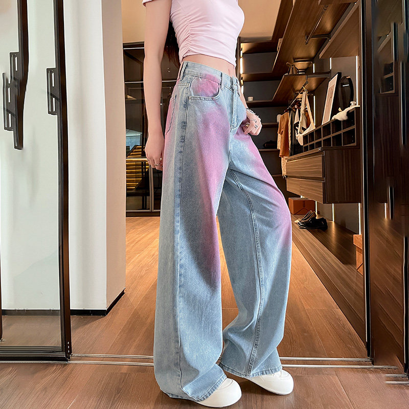女2026年春夏高腰显瘦垂感直筒拖地裤 网红爆款 粉蓝渐变阔腿牛仔裤