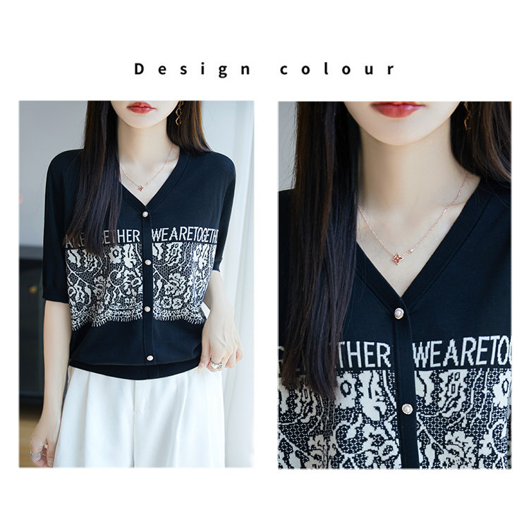 女短袖 冰丝针织衫 T恤宽松遮肚子巨显瘦V领印花上衣 夏装 气质通勤