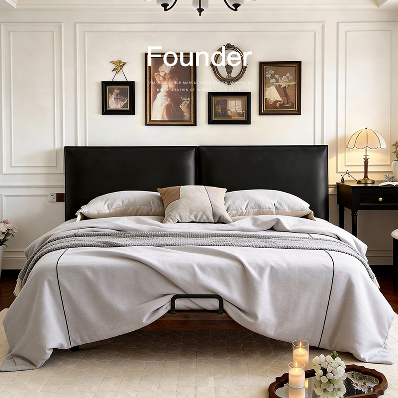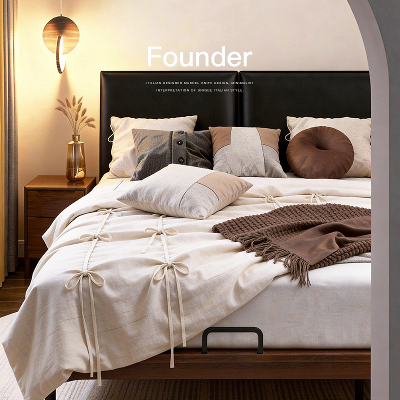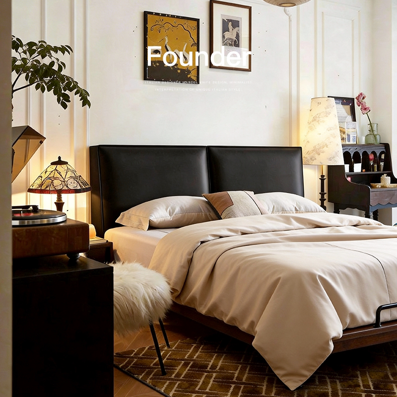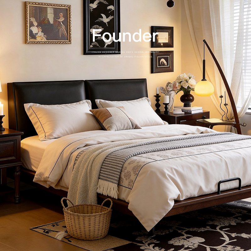 已夏 中古风主卧室复古风北美白蜡木双人简约全真皮床实木 墨方床