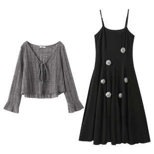 胖mm气质复古吊带连衣裙小开衫 女装 套装 春秋季 130 新款 350斤大码