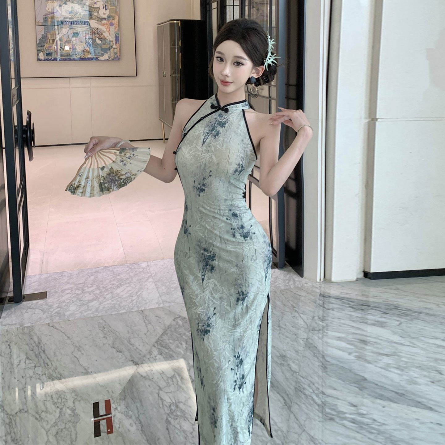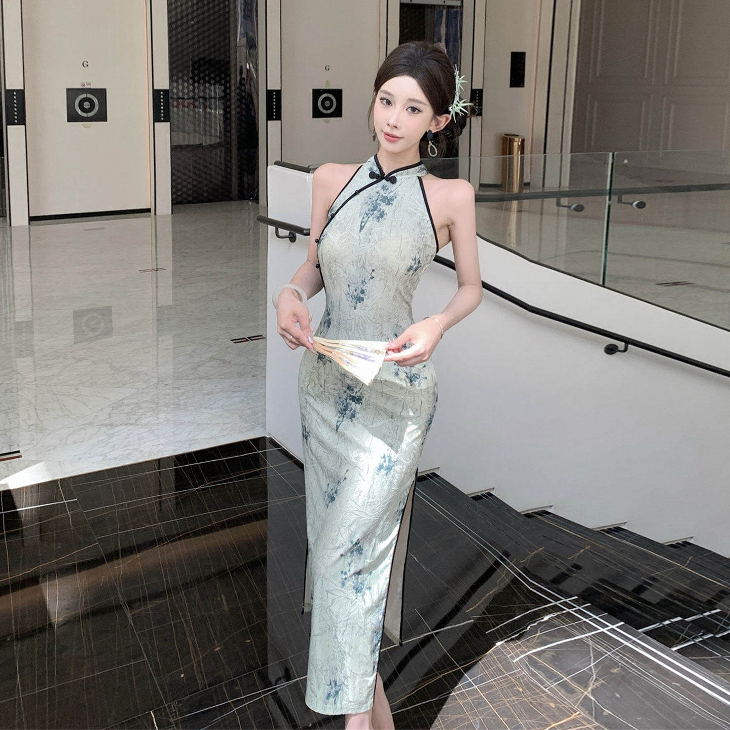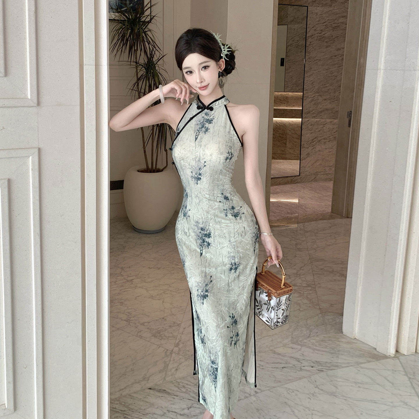 国风夜场KTV技师服女夏性感制服挂脖旗袍长裙修身 包臀开叉连衣裙