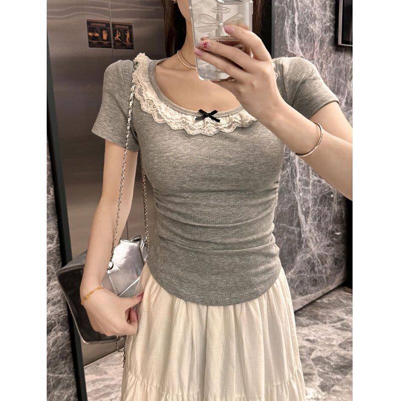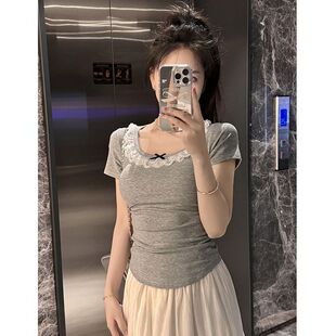 t恤不规则撞色U领时尚 短袖 上衣ins潮 蕾丝边修身 2026小众韩系新款