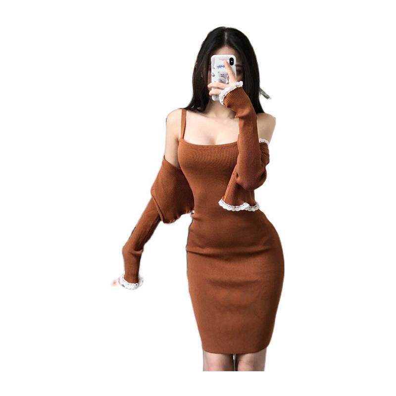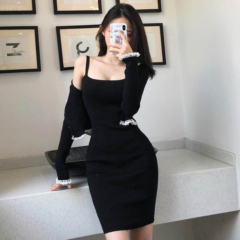 花边短款 长袖 外套 性感吊带修身 潮 格格家 包臀连衣裙针织套装 春季