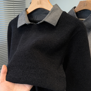 男装 雪尼尔假两件衬衫 青年纯色针织衫 加绒加厚冬季 内搭 领毛衣男款