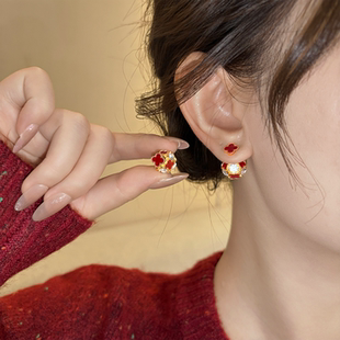 秋冬红色花朵耳环2025新款 高级感耳钉小众设计感耳夹女无耳洞 爆款