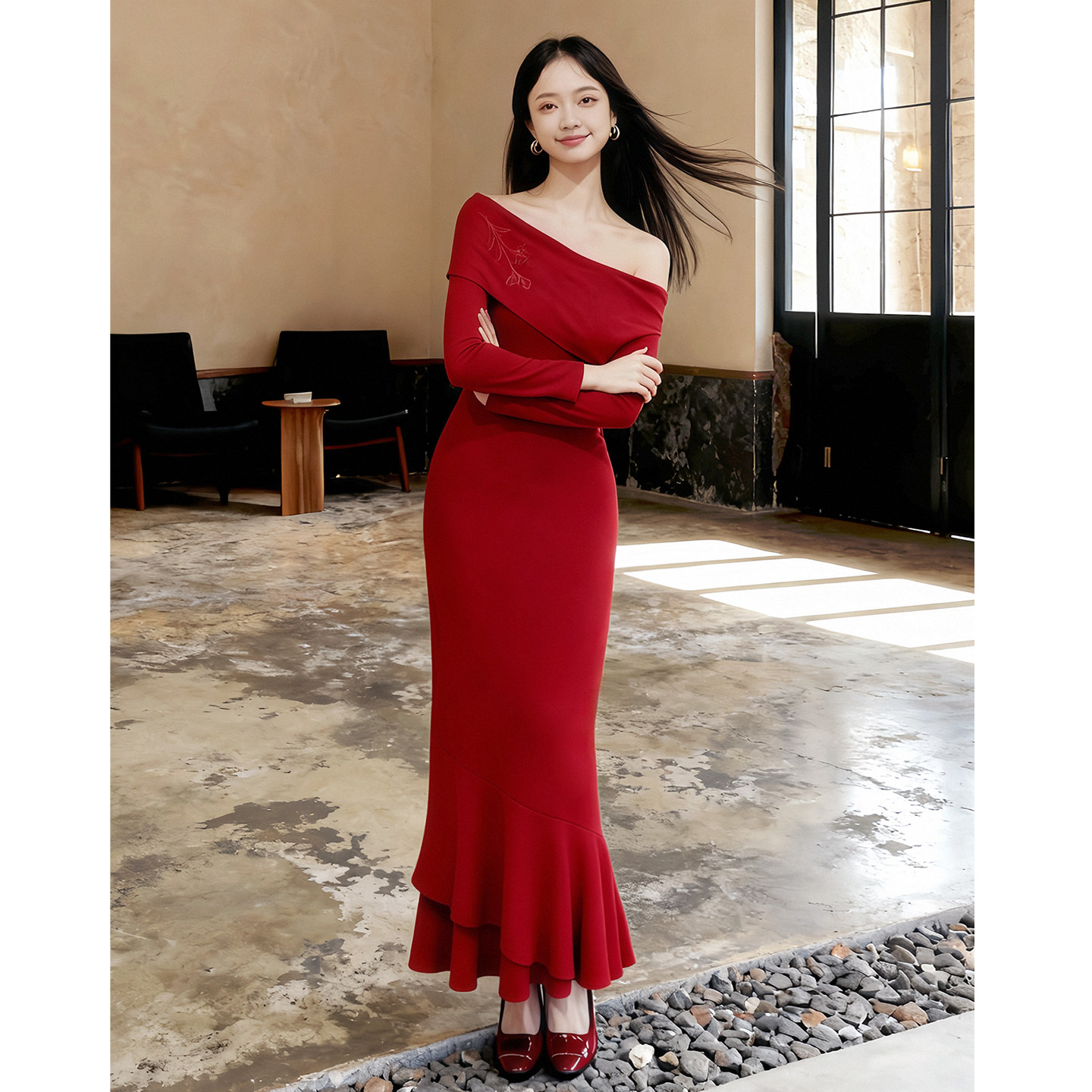 鹿与玫瑰法式 显瘦订婚礼服敬酒服 复古红色一字肩连衣裙女气质修身