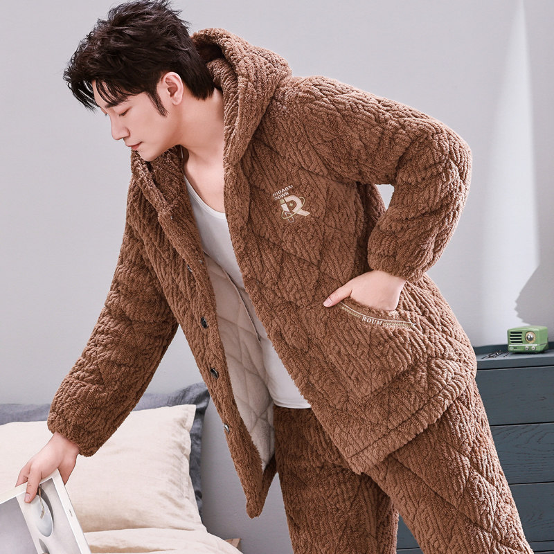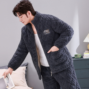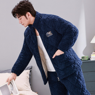 法兰绒保暖家居服套装 三层加厚夹棉加绒珊瑚绒秋冬款 冬季 睡衣男士