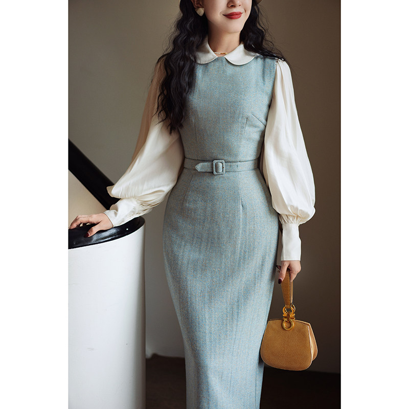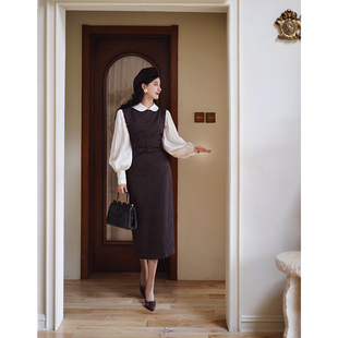 法式 小香风千金格子蓝色打底a字裙 娃娃领假两件绝美连衣裙女冬季