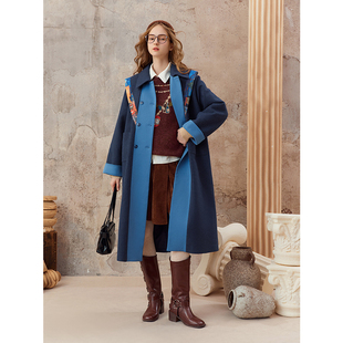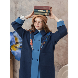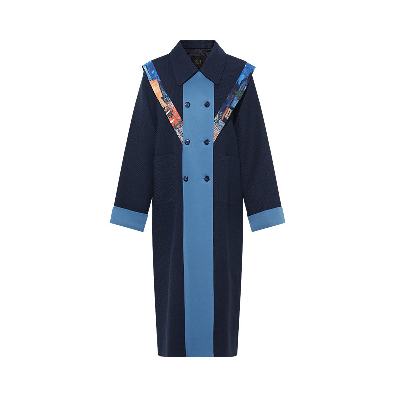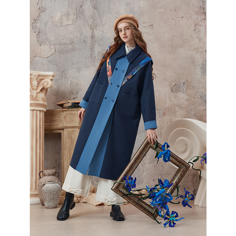 两三事梵高文艺莱茵河畔拼接拼色海军领毛呢外套 爆米花专享
