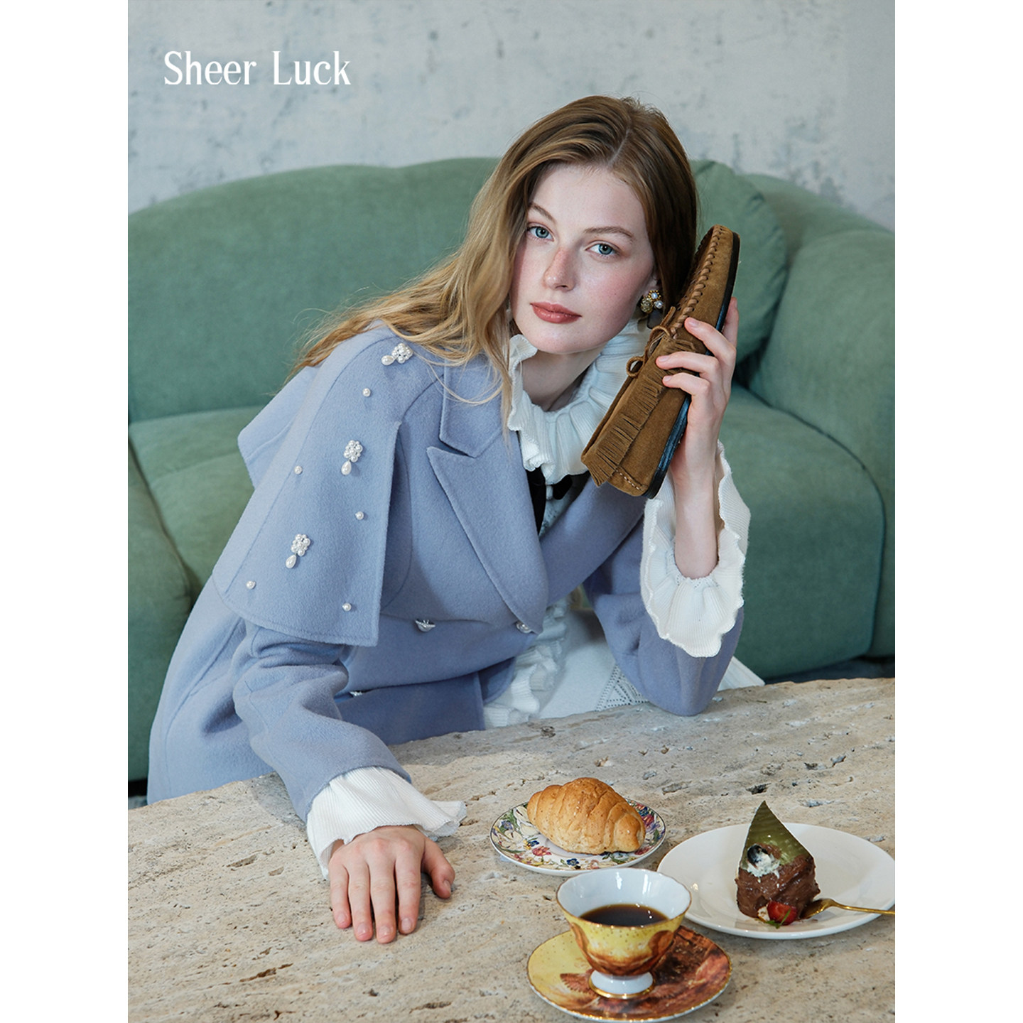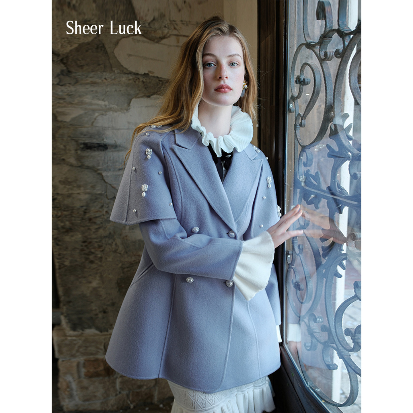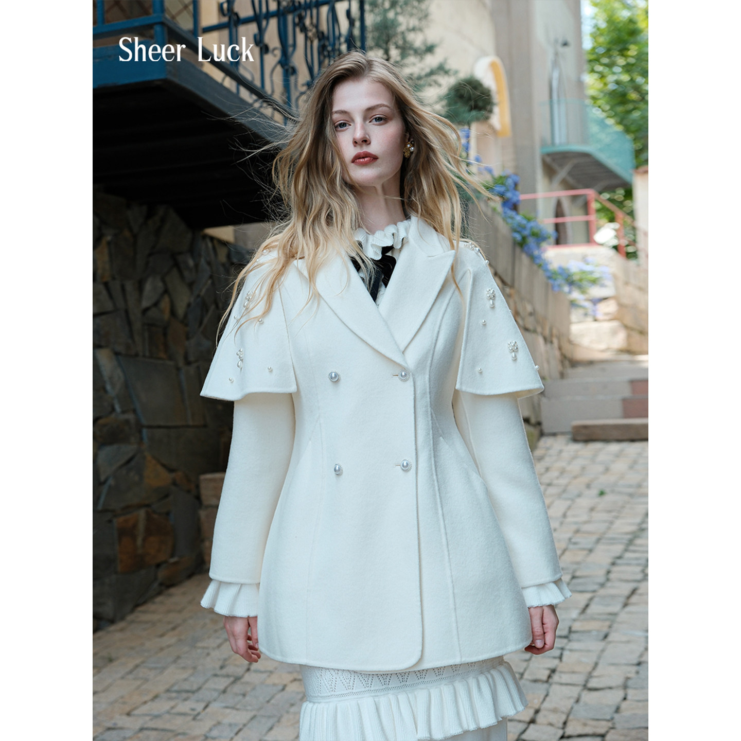 Sheer Mira设计感复古珍珠斗篷羊毛毛呢大衣外套女 Luck