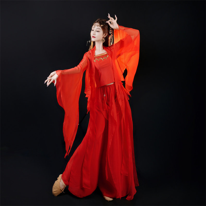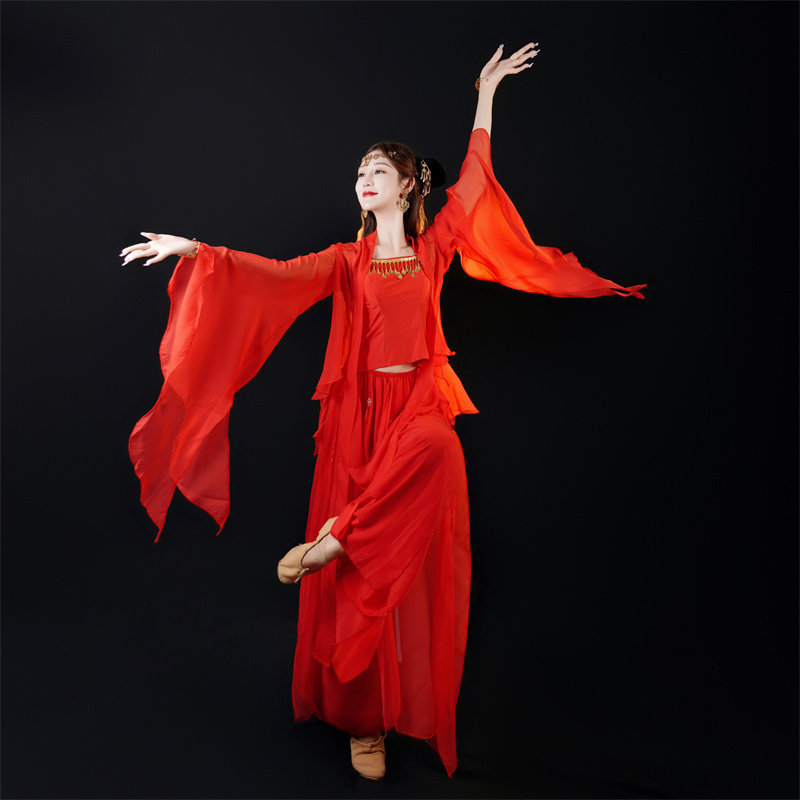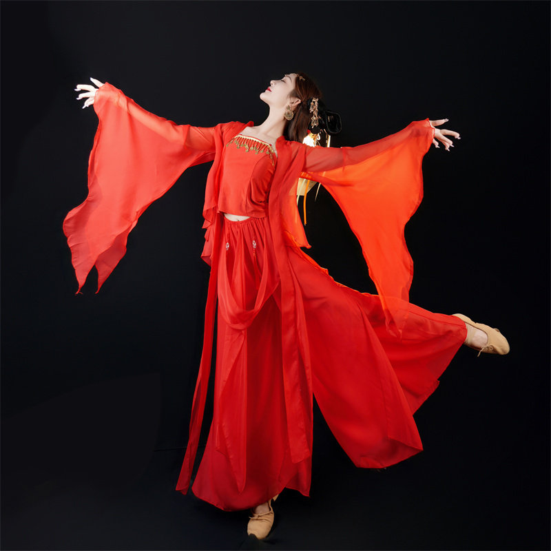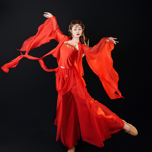 中国风舞蹈古典舞民族练功表演汉服飘逸水袖 纱衣演出红色摆裙套装