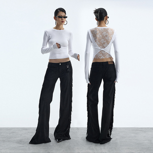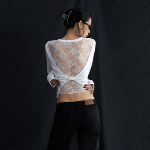 上衣 ourhour 长袖 白色圆领修身 女冬设计感打底衣 蝴蝶结蕾丝露背