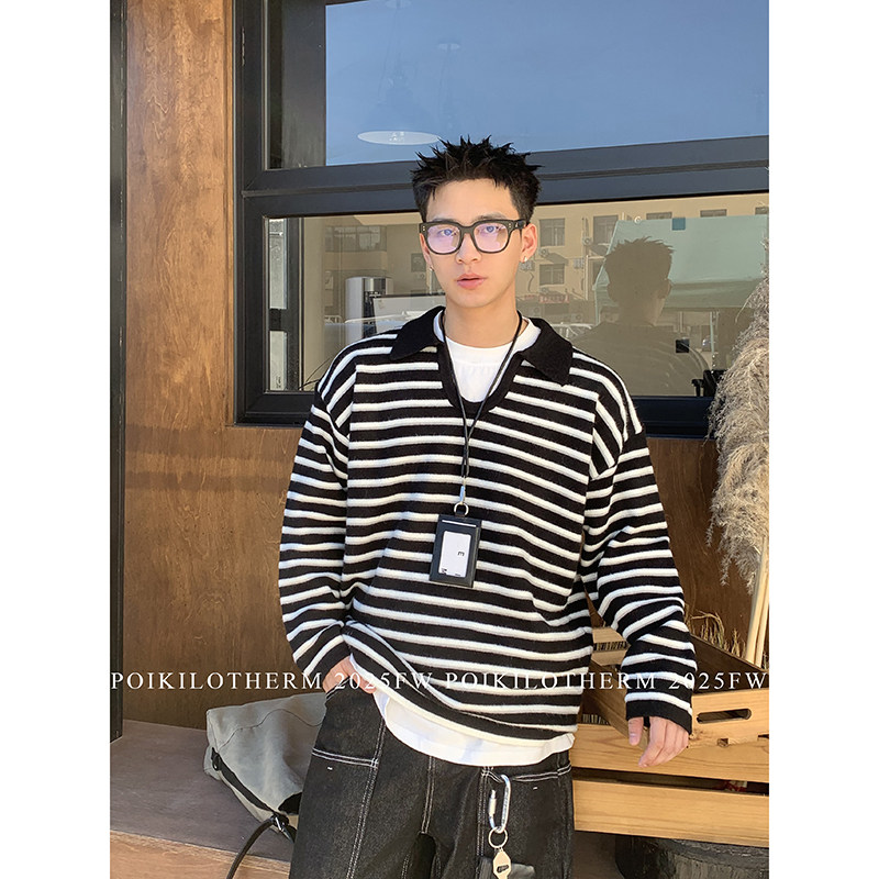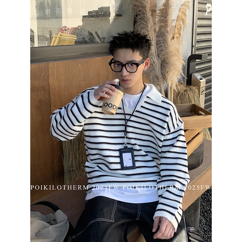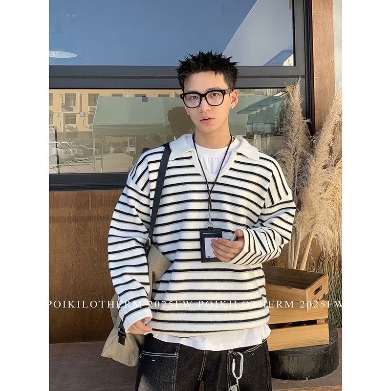 宽松V领叠穿松驰慵懒风上衣 简约撞色条纹套头毛衣男冬季 PLTH 美式
