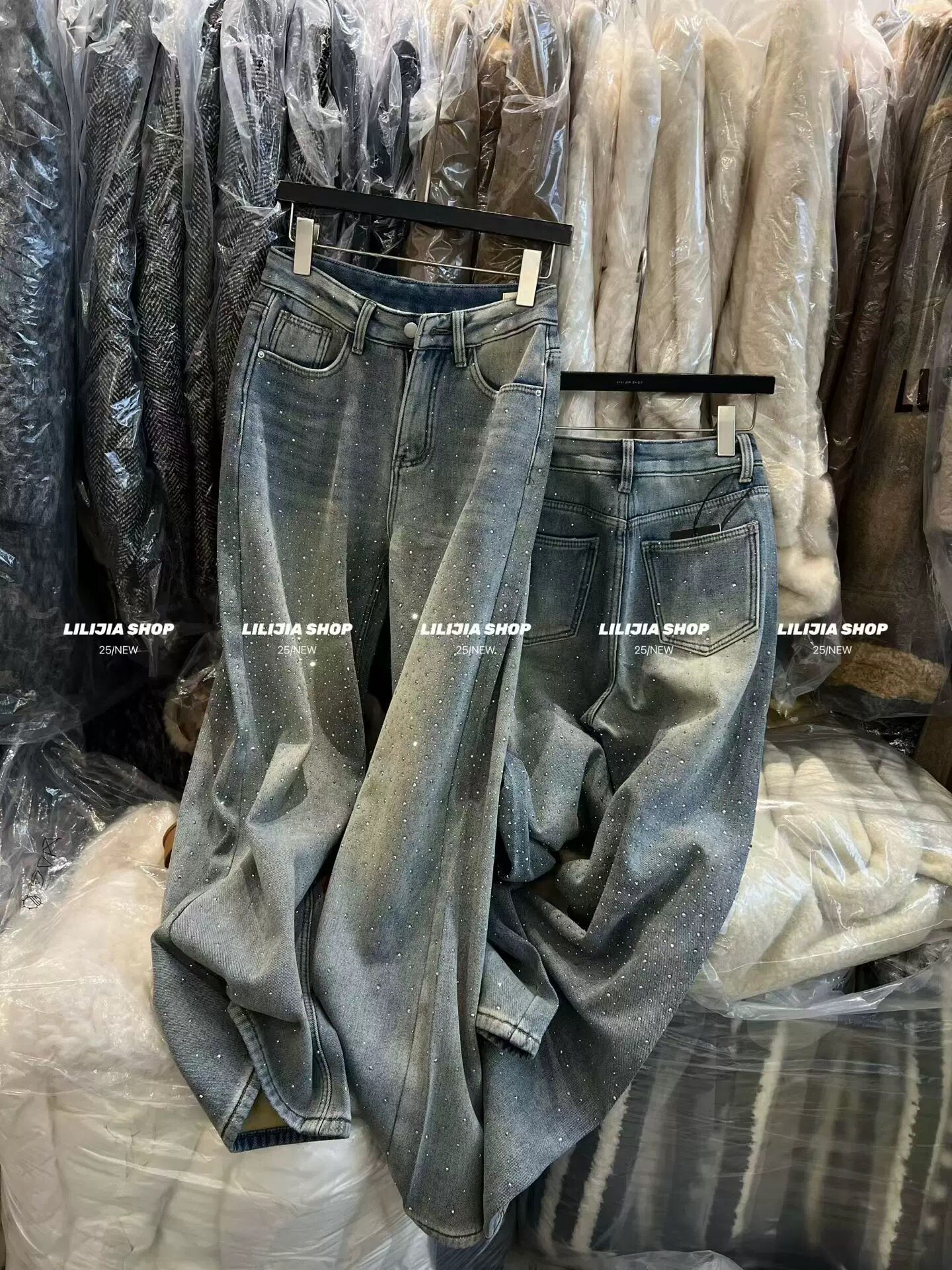 2025秋冬新款 满天星重工烫钻宽松加绒百搭洋气直筒牛仔裤