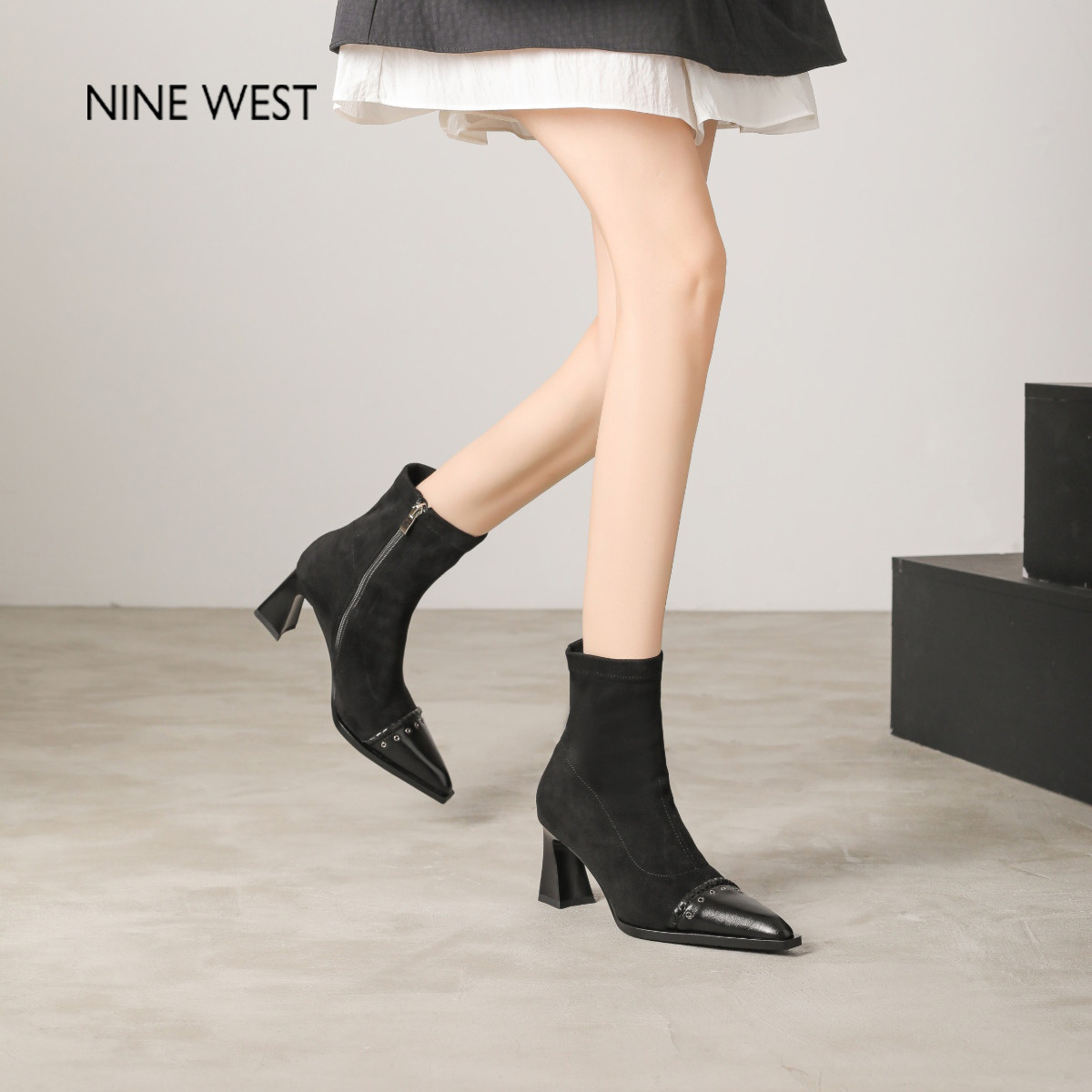 百丽女靴子弹力靴褶皱新款 靴通勤显瘦瘦短靴B2348DZ4 粗高跟时装