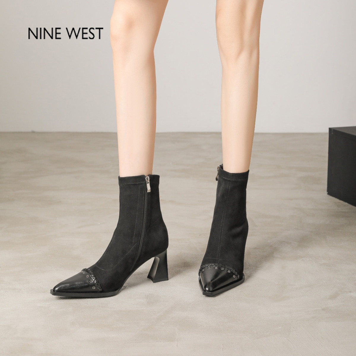 百丽画廊假日加绒时装 弹力靴反绒面粗高跟显瘦瘦短靴子BBWB1DZ5