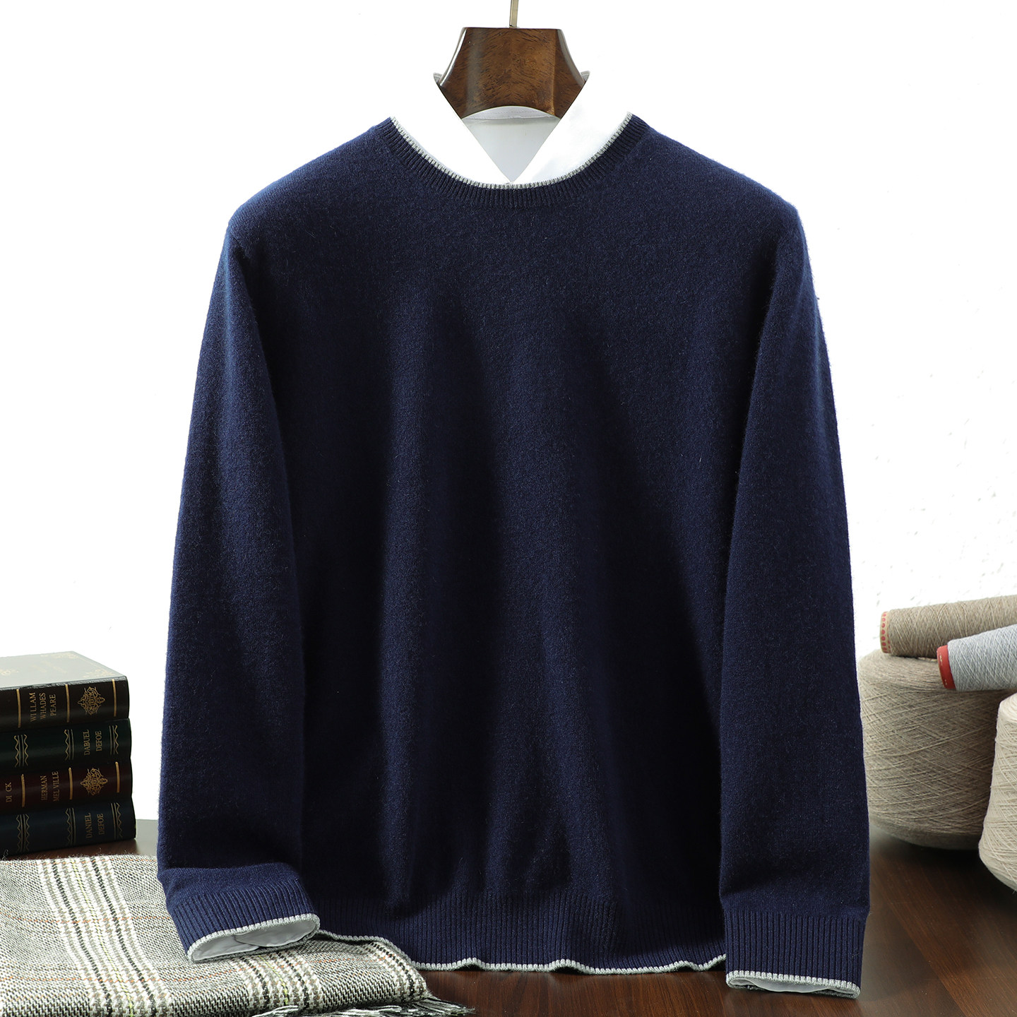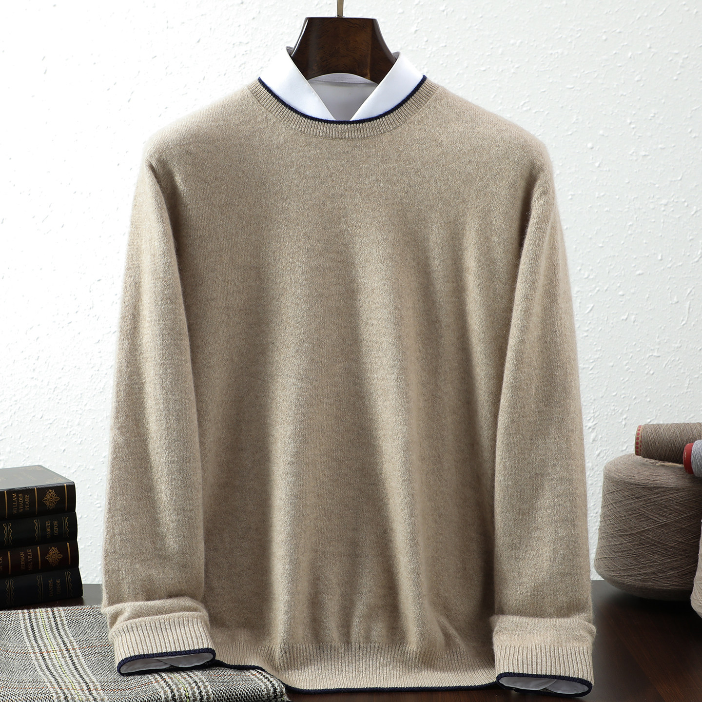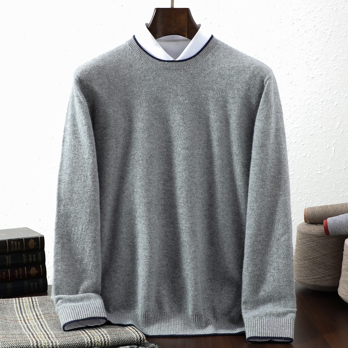 2025秋冬新款 男100%纯山羊绒针织宽松简约打底毛衣 圆领拼色羊绒衫