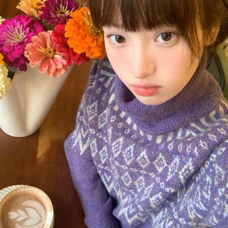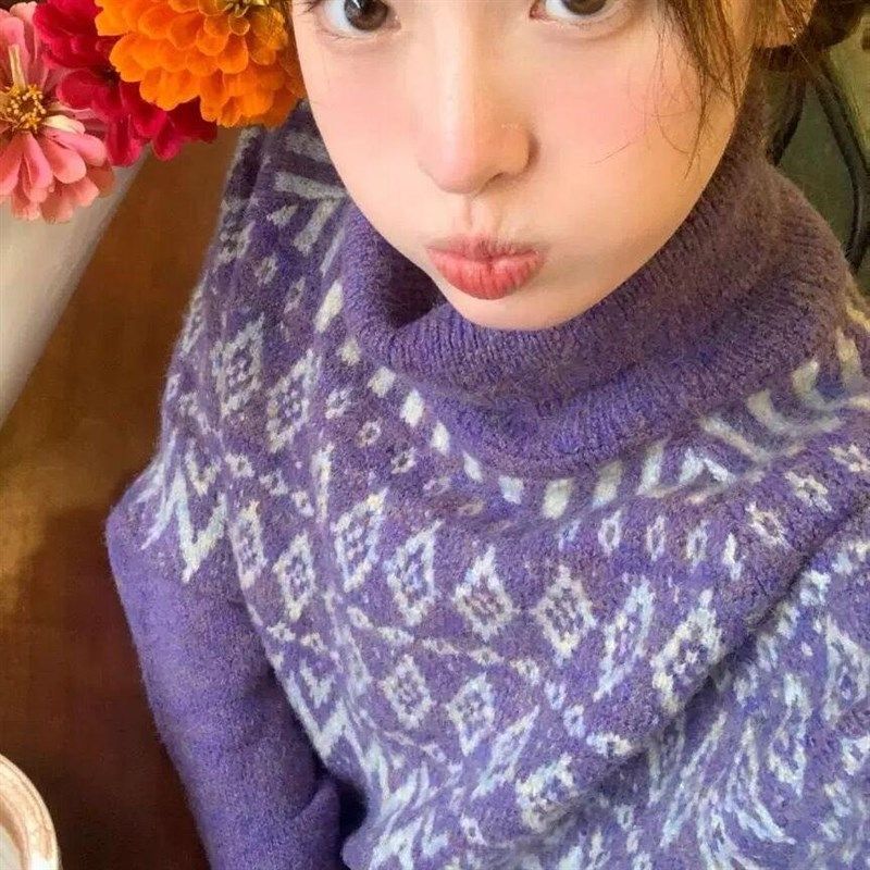 宽松打底针织衫 檀木紫 韩版 新款 软糯复古菱格高s领套头毛衣女春装