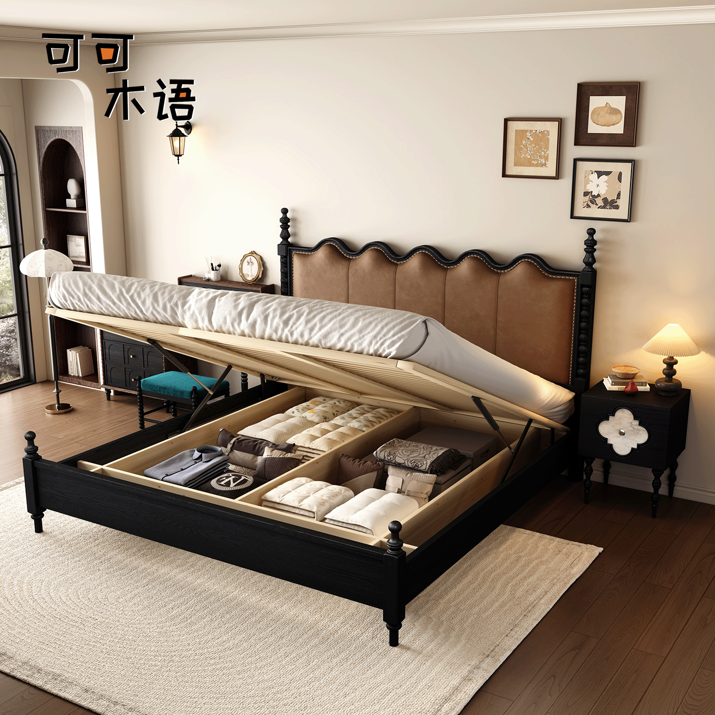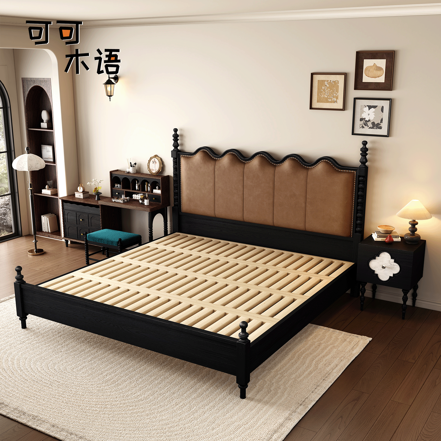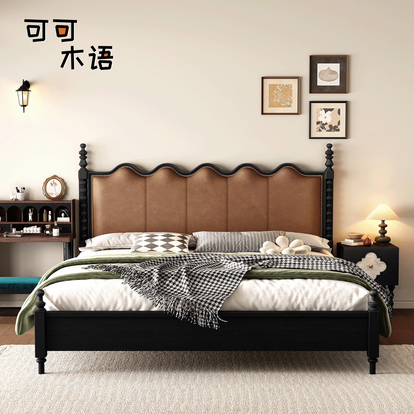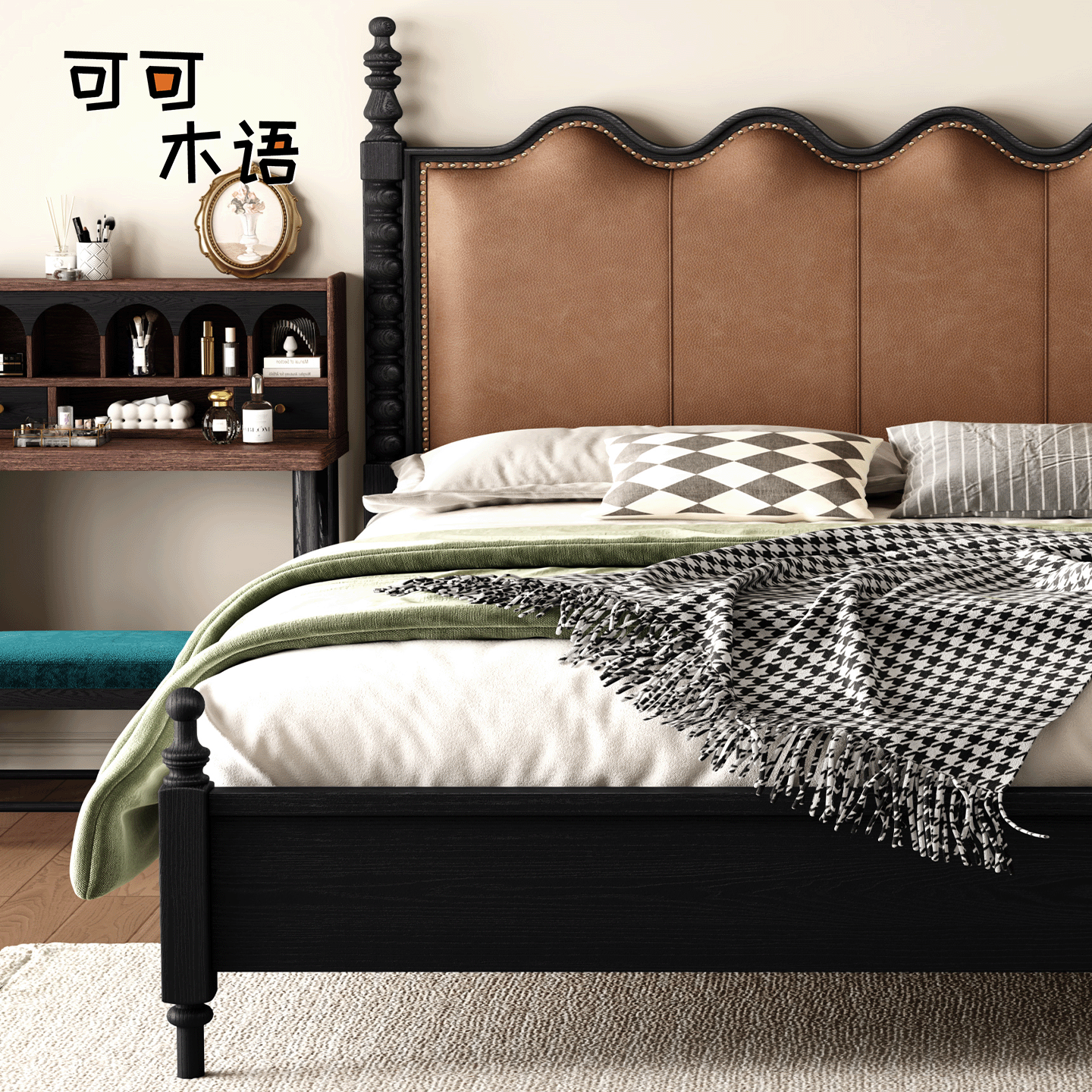 法式 头层牛皮涟漪红橡木大床 复古双人实木软包真皮床主卧大床美式
