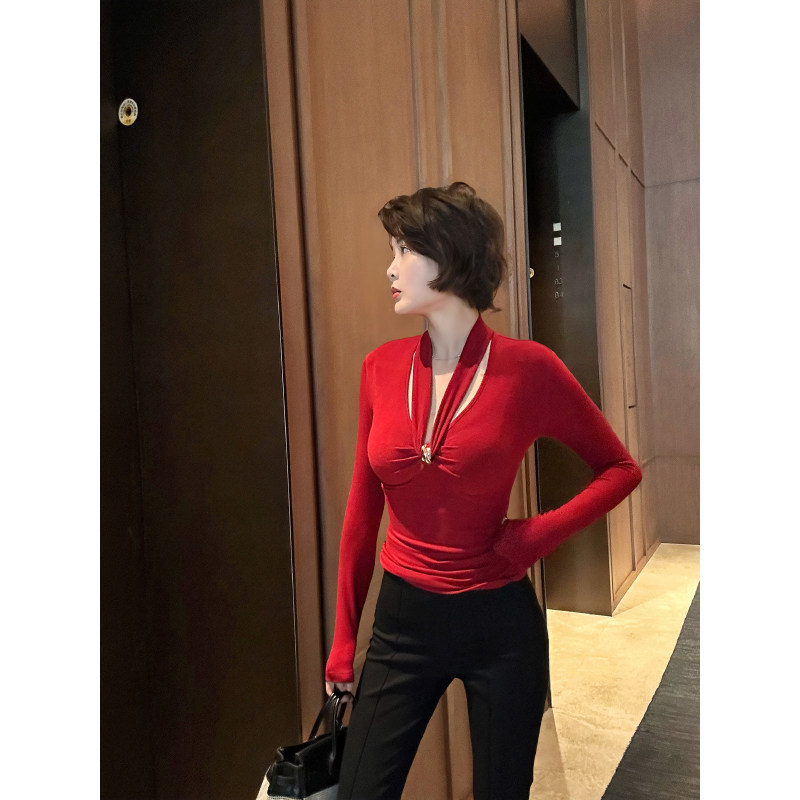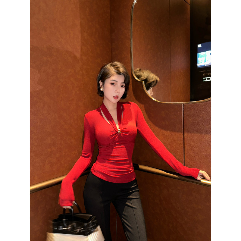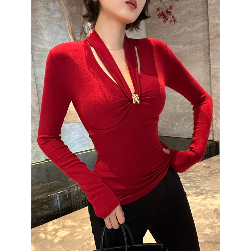 性感V领挂脖长袖 打底衫 上衣 美利诺慕斯绒红色修身 XULU原创新款