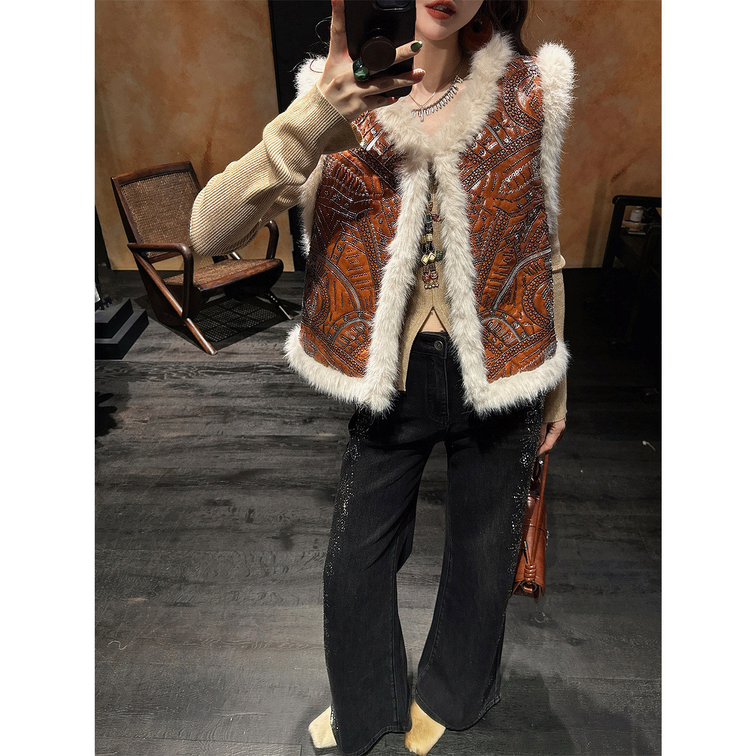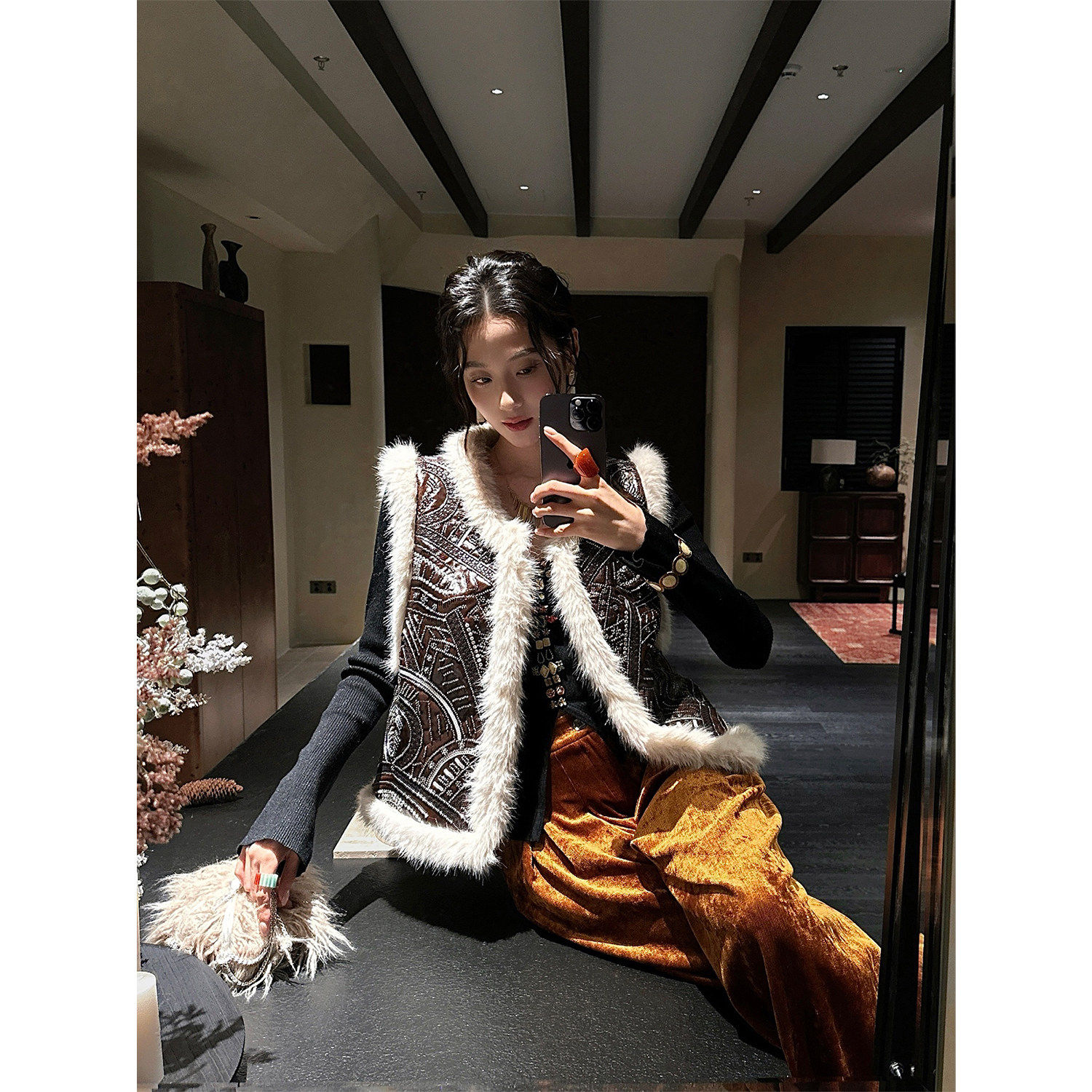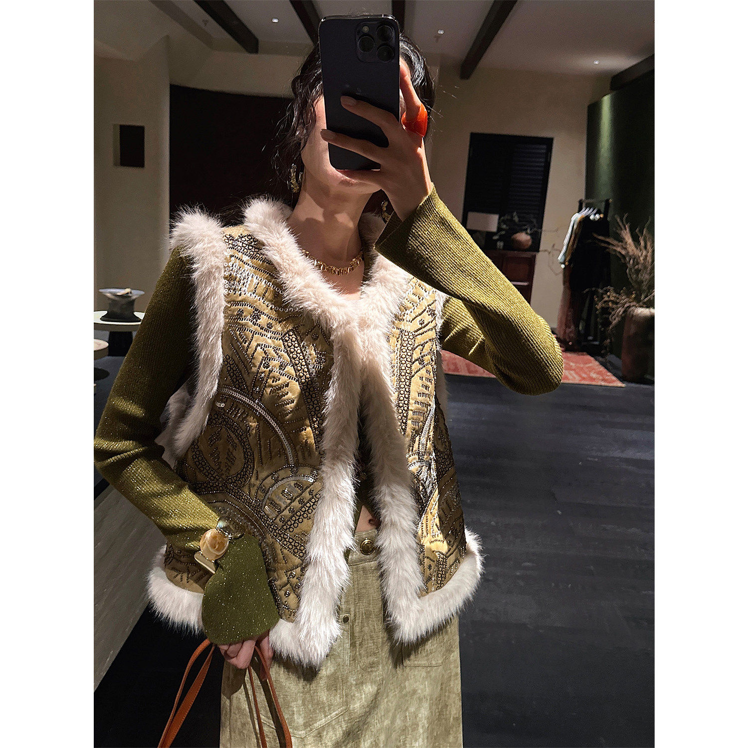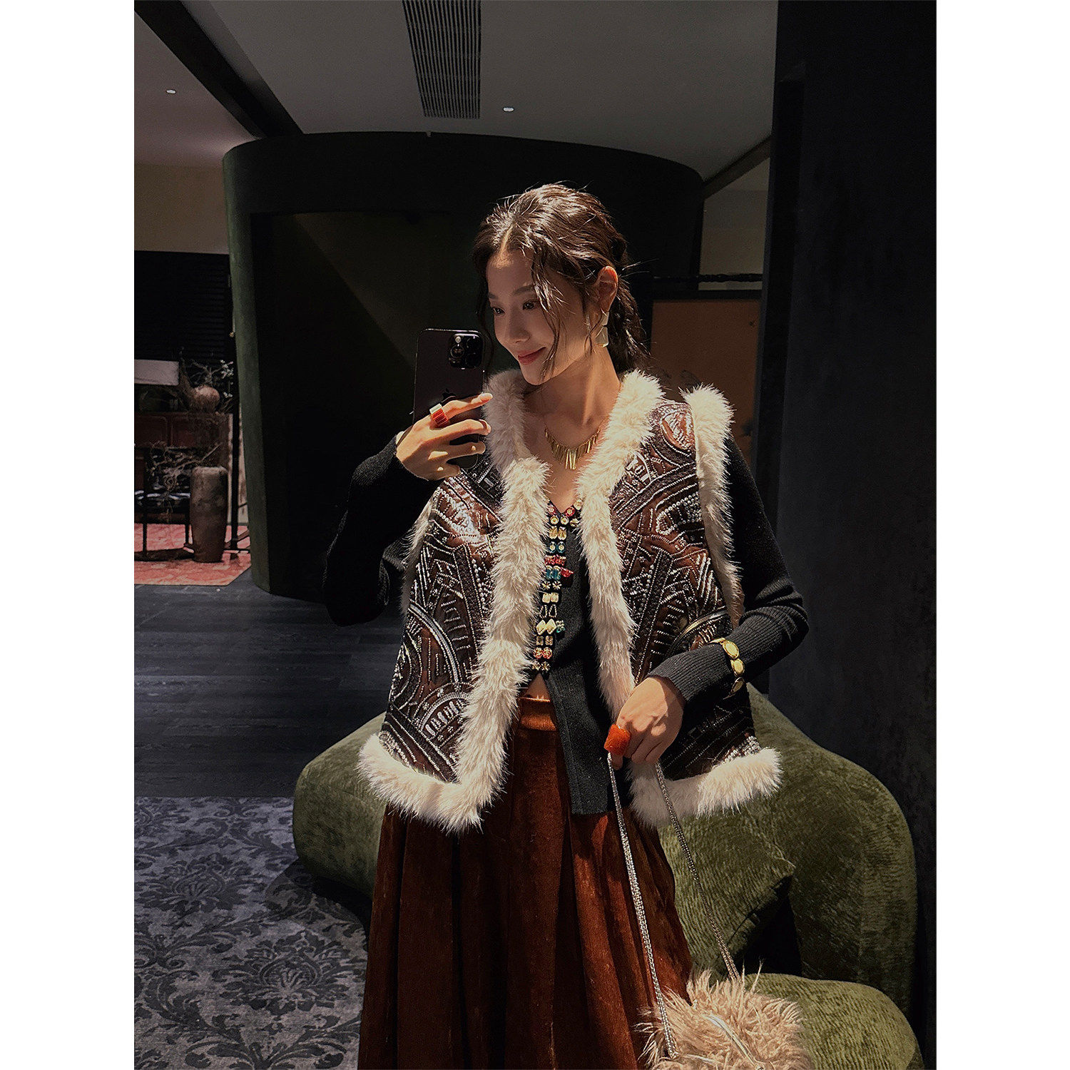 新款 月见 重工刺绣民族风环保毛毛马甲女时髦洋气 哼哈冰冰