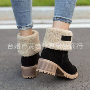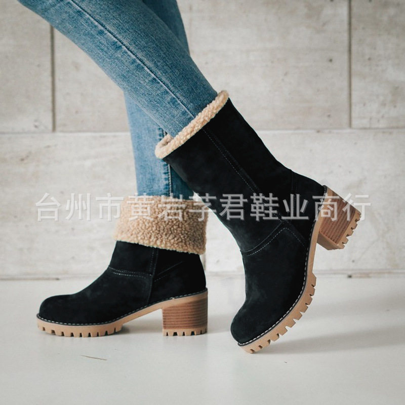wish亚马逊爆款 女靴 2018秋冬欧美中筒粗跟翻毛雪地靴棉靴43码