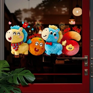 饰 5D小马绒毛质感国风玻璃静电贴新年元 旦春节贴墙贴窗花装
