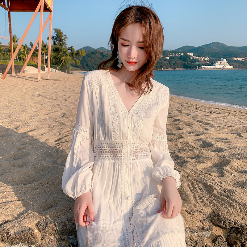 实拍2020新款 海边度假沙滩裙V领高腰长裙显瘦白色镂空蕾丝连衣裙