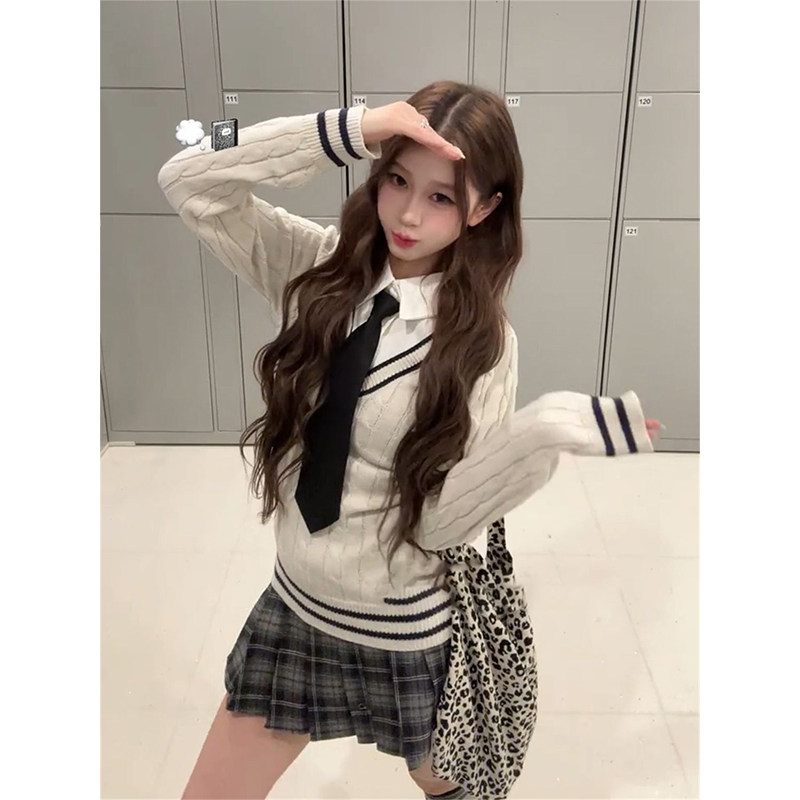 两件套装 白色衬衫 黑色领带 秋冬甜妹学院风撞色v领条纹麻花毛衣