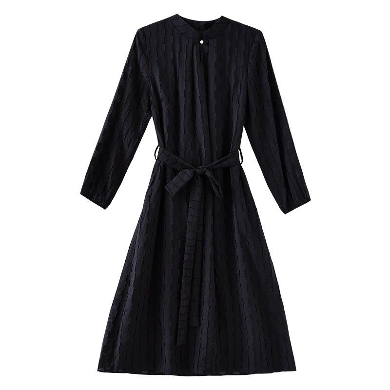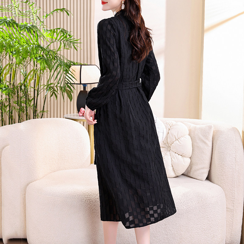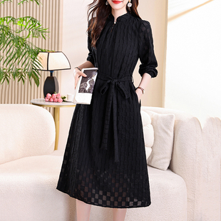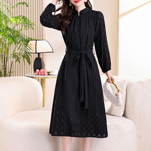 有里布口袋雪纺提花旗袍l领系带腰连衣裙中长款 长袖 2025秋季 新品