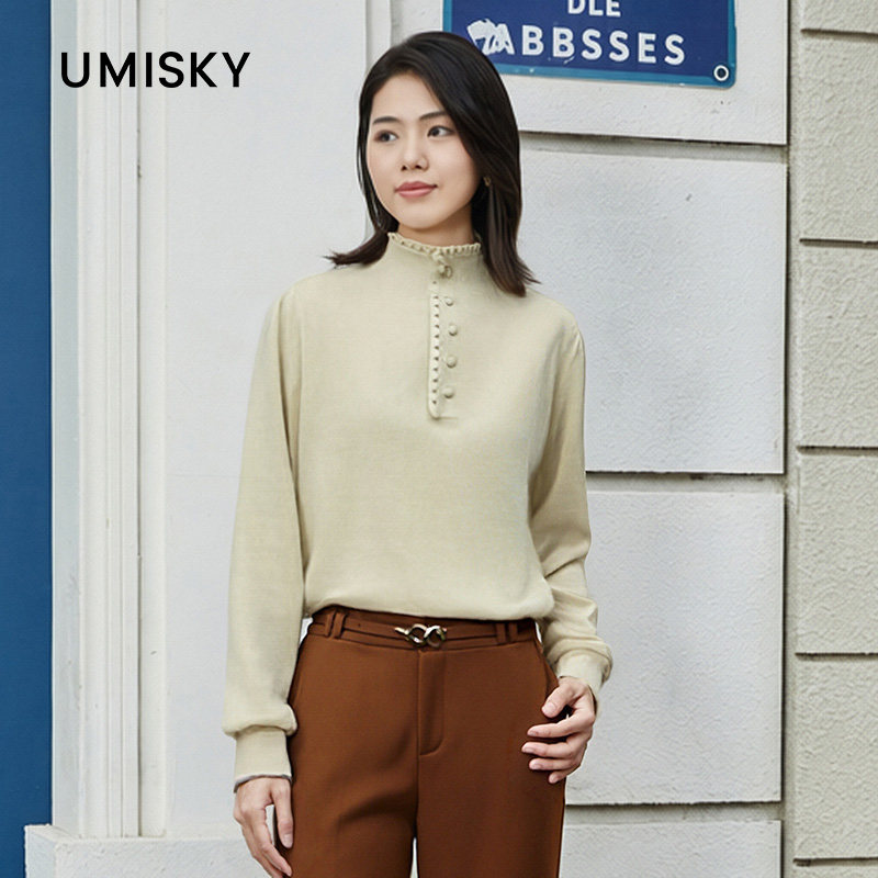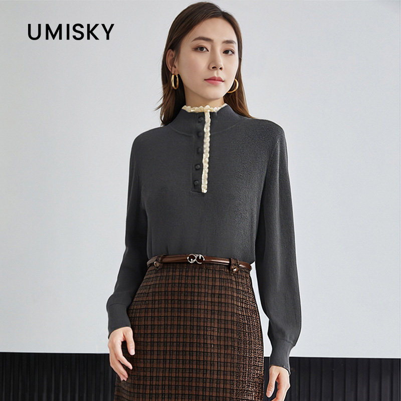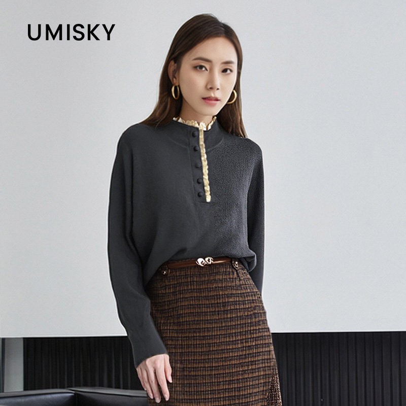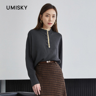 umisky优美世界冬季 毛衣DK4W2019 立领钉珠宽松针织衫