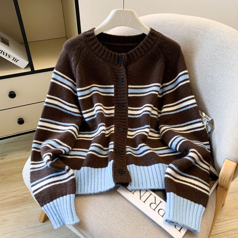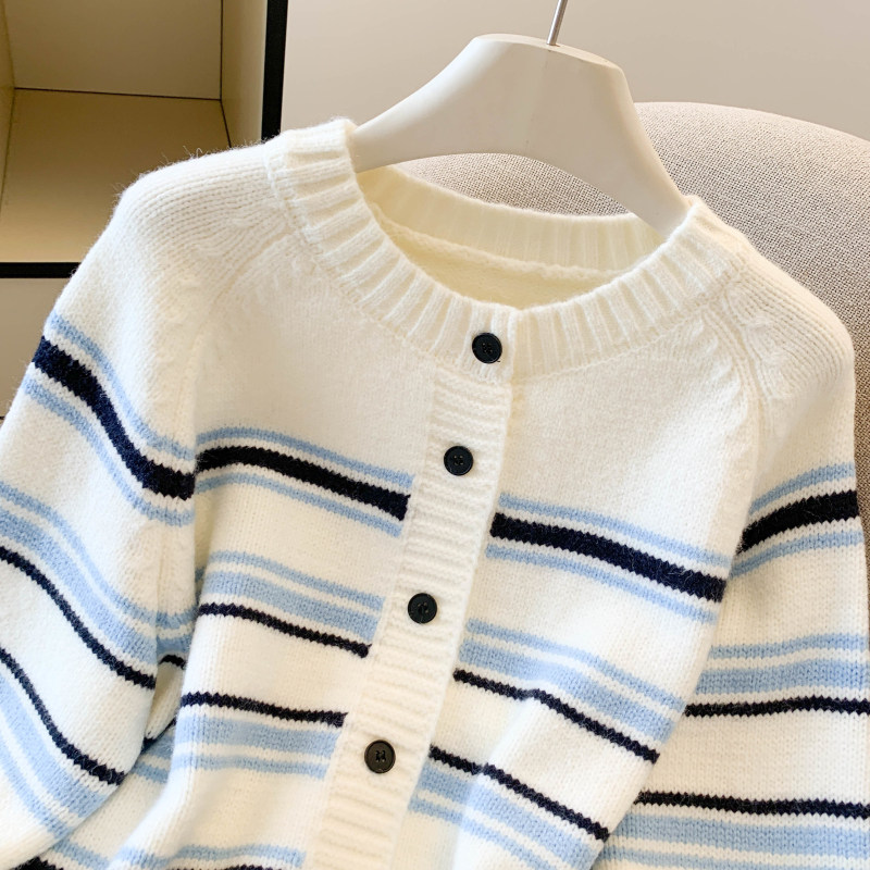森系学院风条纹针织圆领单排扣毛衣开衫 实拍 韩版 时尚 外套 高品质