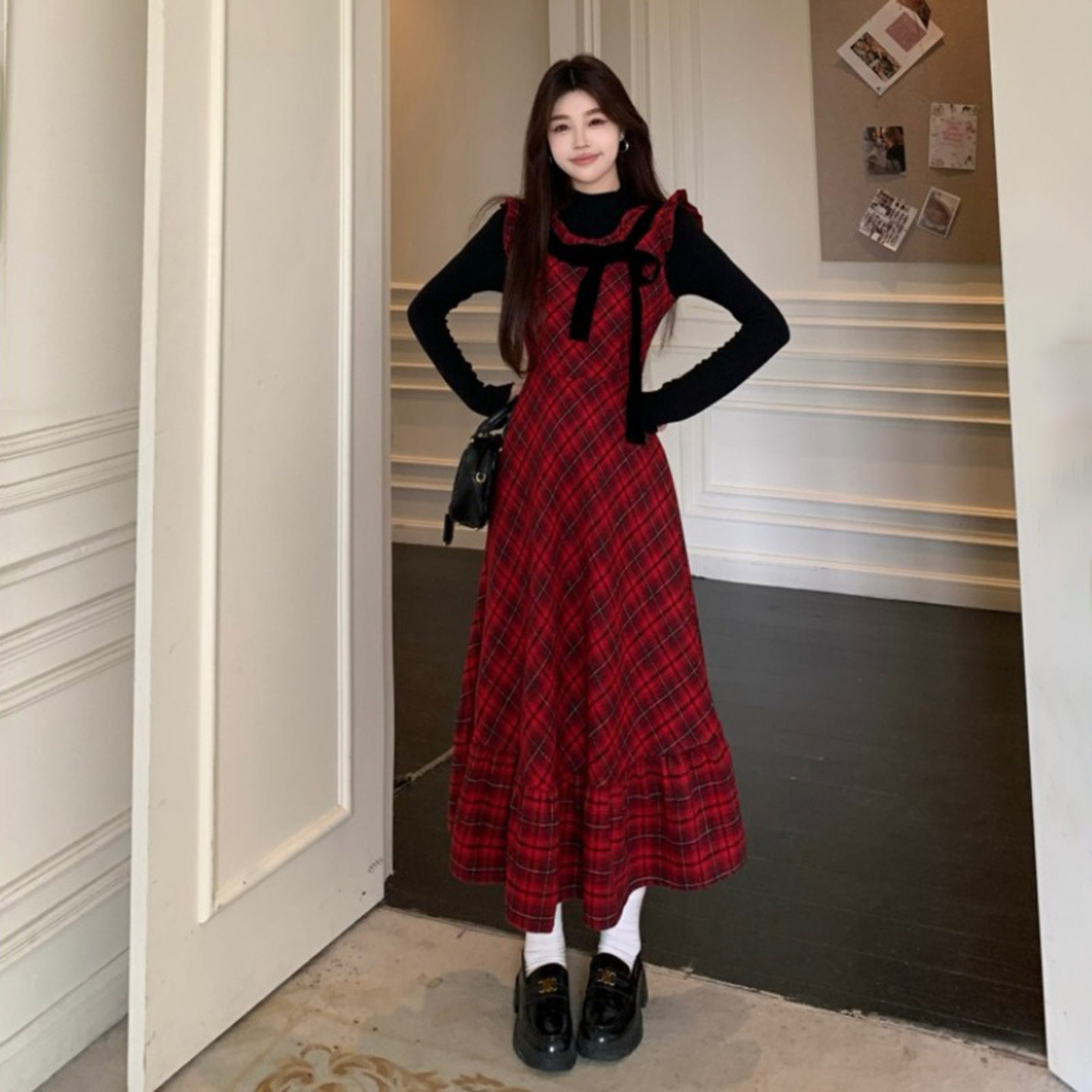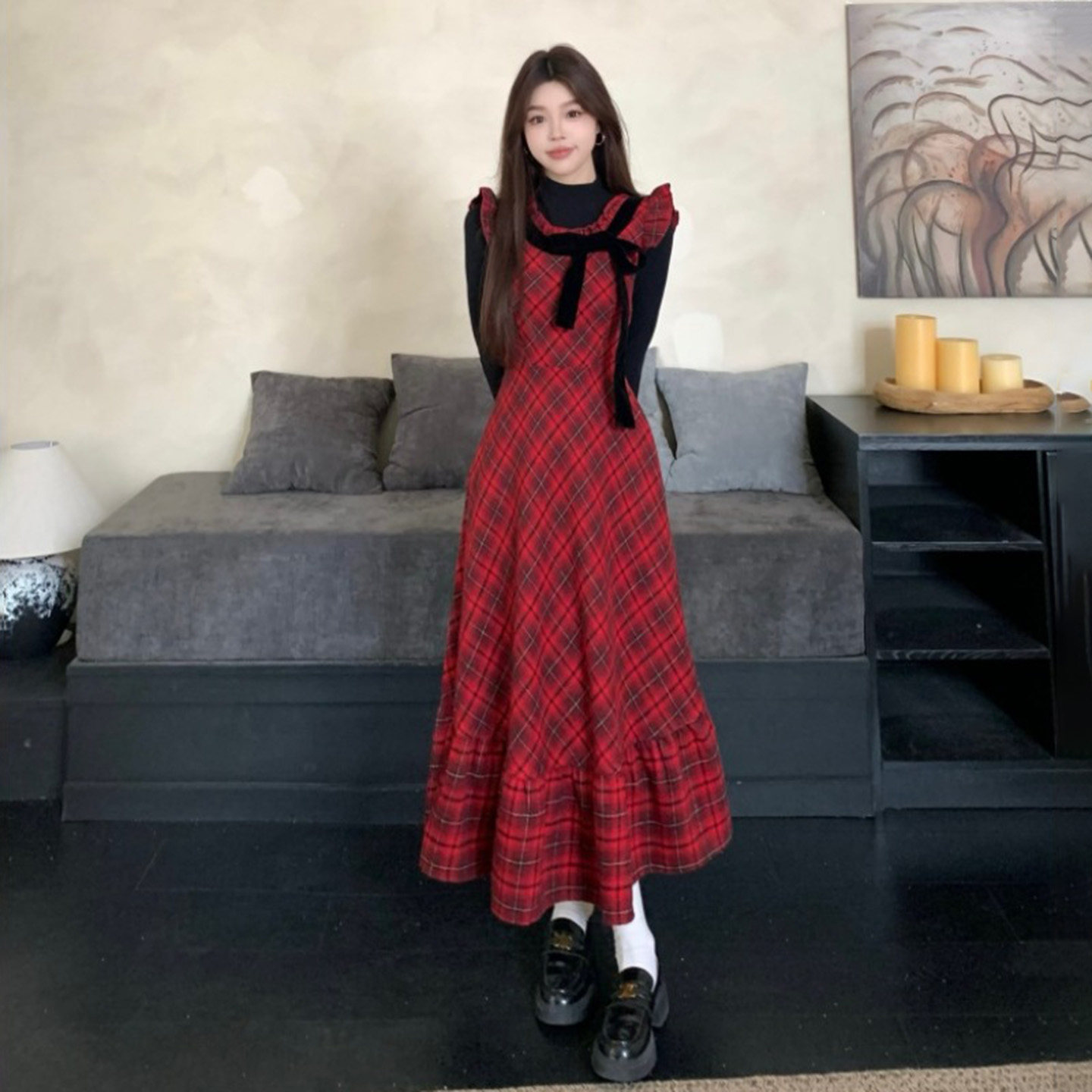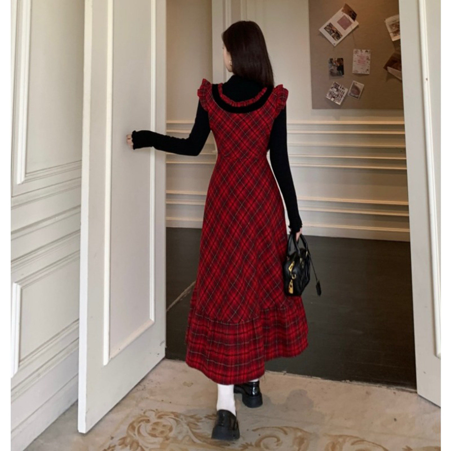 气质荷叶边拼接A字修身 连衣裙女秋季 长裙子 复古miu系撞色长袖 法式