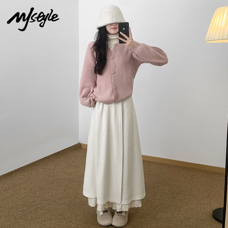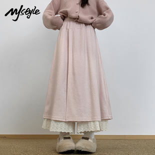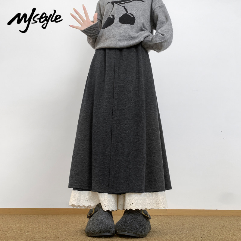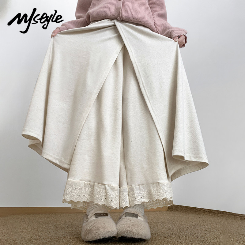 女2025秋冬拼接蕾丝屁帘休闲裤 阔腿裤 STYLE韩系假两件拼接裙裤