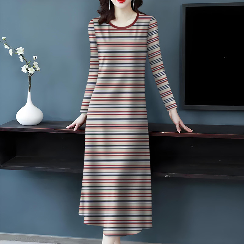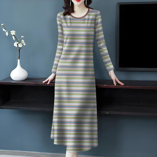 休闲慵懒风长款 新款 宽松显瘦长裙子 连衣裙女秋季 复古气质条纹长袖