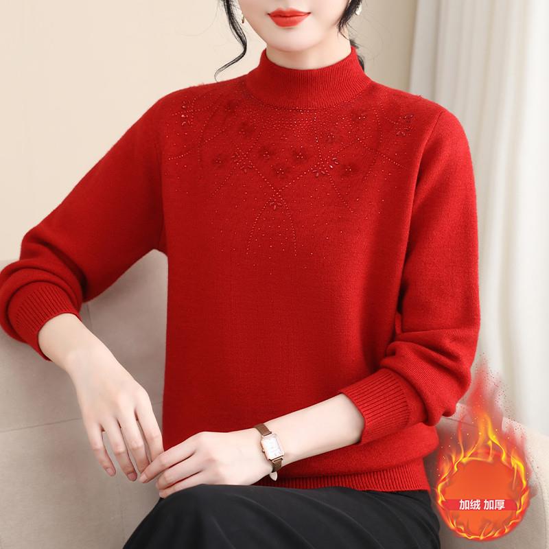 加厚加绒针织衫 纯色大码 毛衣中老年女装 中老年半高领仿貂毛妈妈装