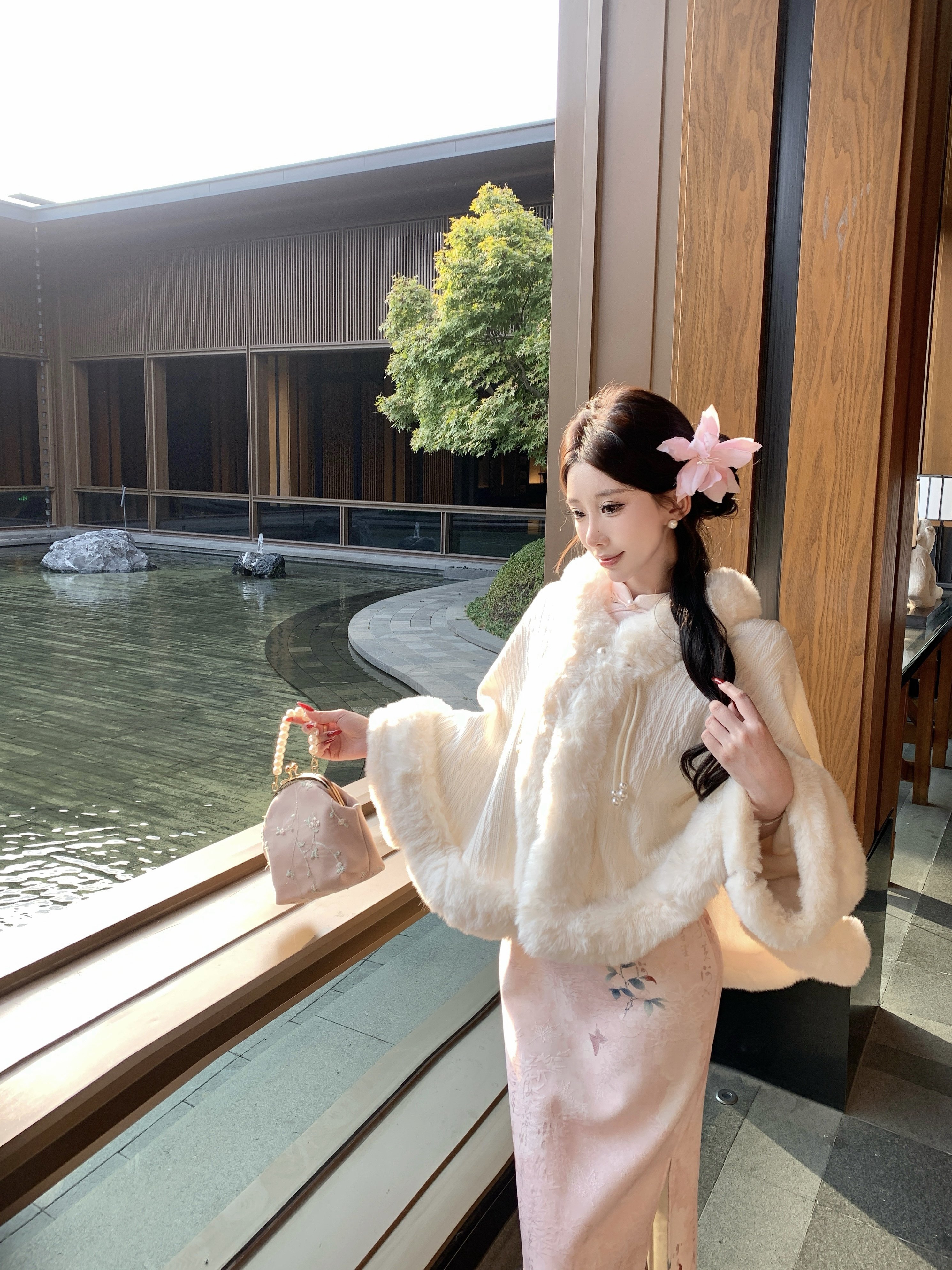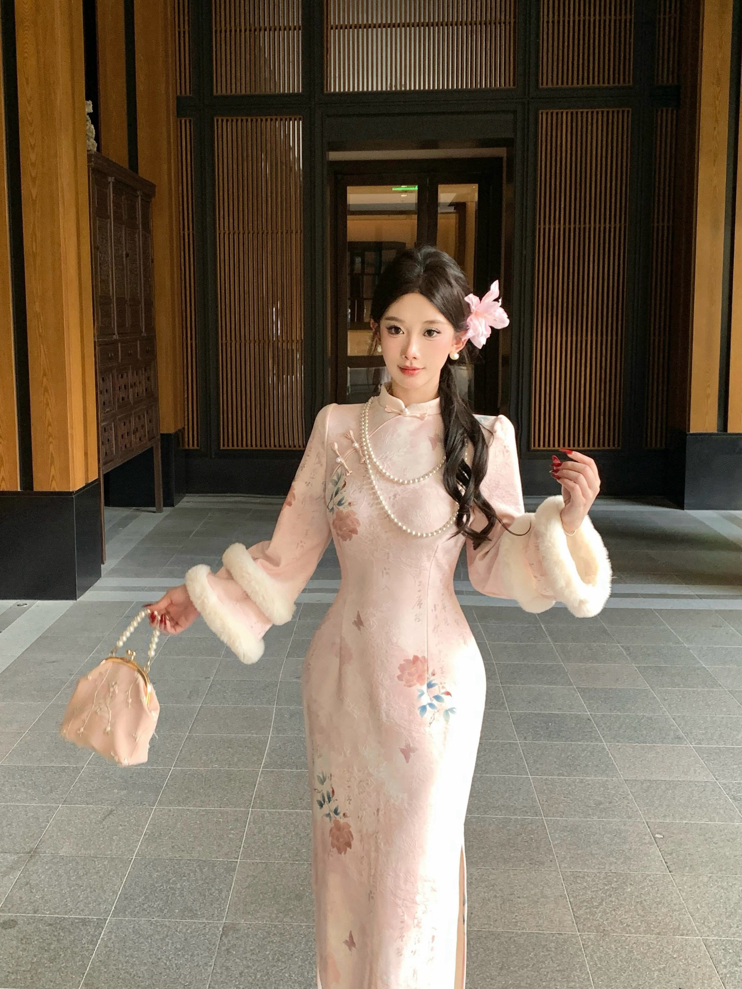 粉色改良旗袍加厚减龄温柔复古国风连衣裙秋冬新款 新中式 Mimo