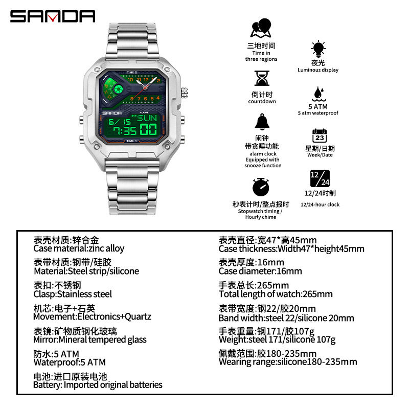 运动腕表 男士 ins爆款 方形学生电子手表夜光防水多功能贪睡时尚