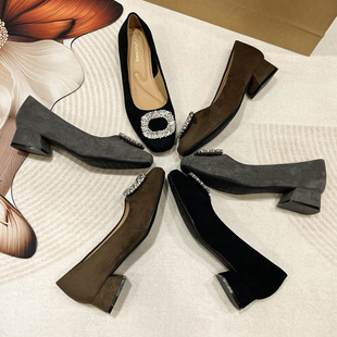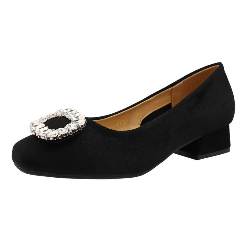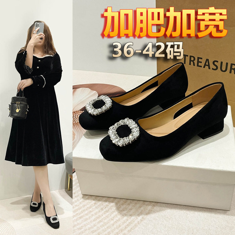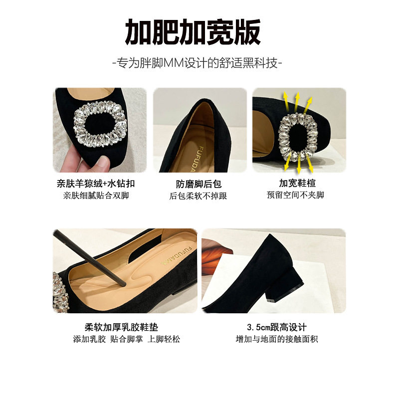 女鞋 338 女加宽加肥大码 气质粗跟低跟水钻方头单鞋 9宽胖脚法式