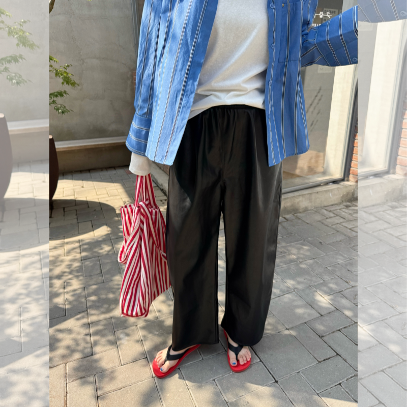 休闲长裤 中性风秋冬新款 女 黑色松弛感百搭宽松松紧九分皮裤 ACRAB