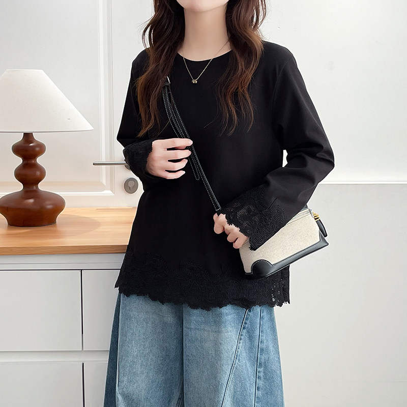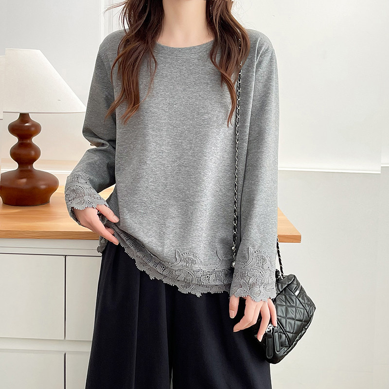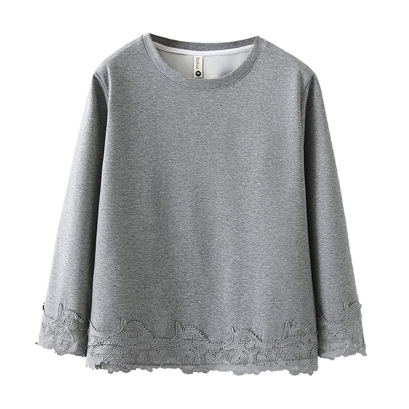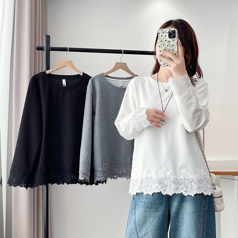 上衣 打底衫 别致大码 圆领蕾丝拼接卫衣女加肥加大200斤胖mm春秋款