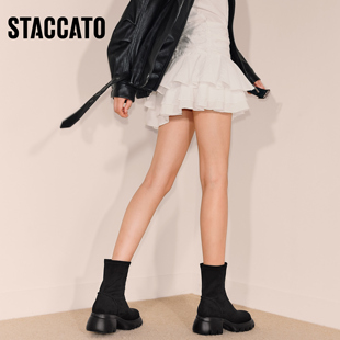 思加图2025新款 百搭弹力靴黑色瘦瘦靴中靴厚底加绒女靴子Y2563DZ5