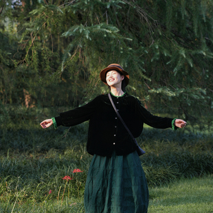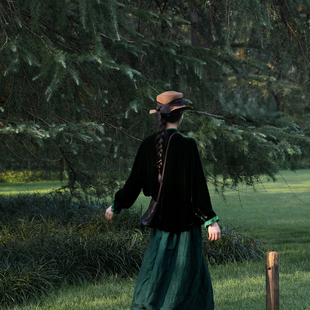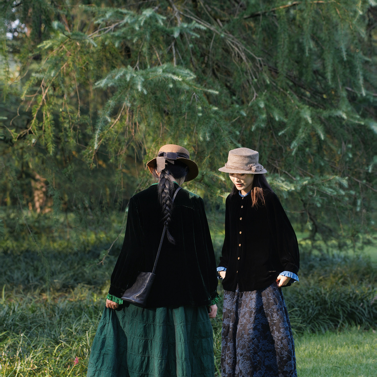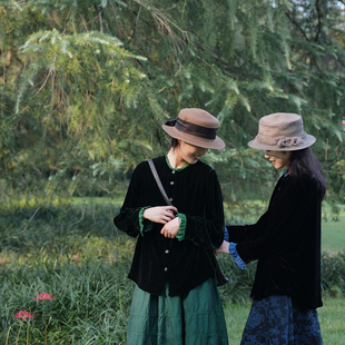 慢慢变蓝原创 古雅精致荷叶领 秋冬细腻顺滑真丝绒衬衫