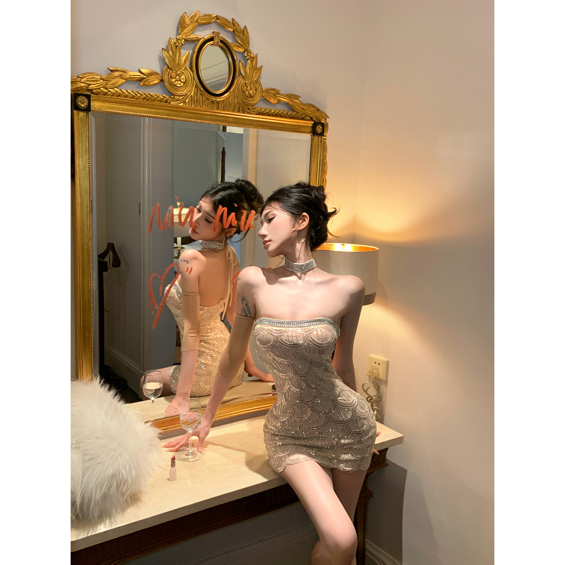 裙子 长袖 ITSNIKAR新中式 复古挂脖连衣裙女荡领盘花刺绣针织裙修身