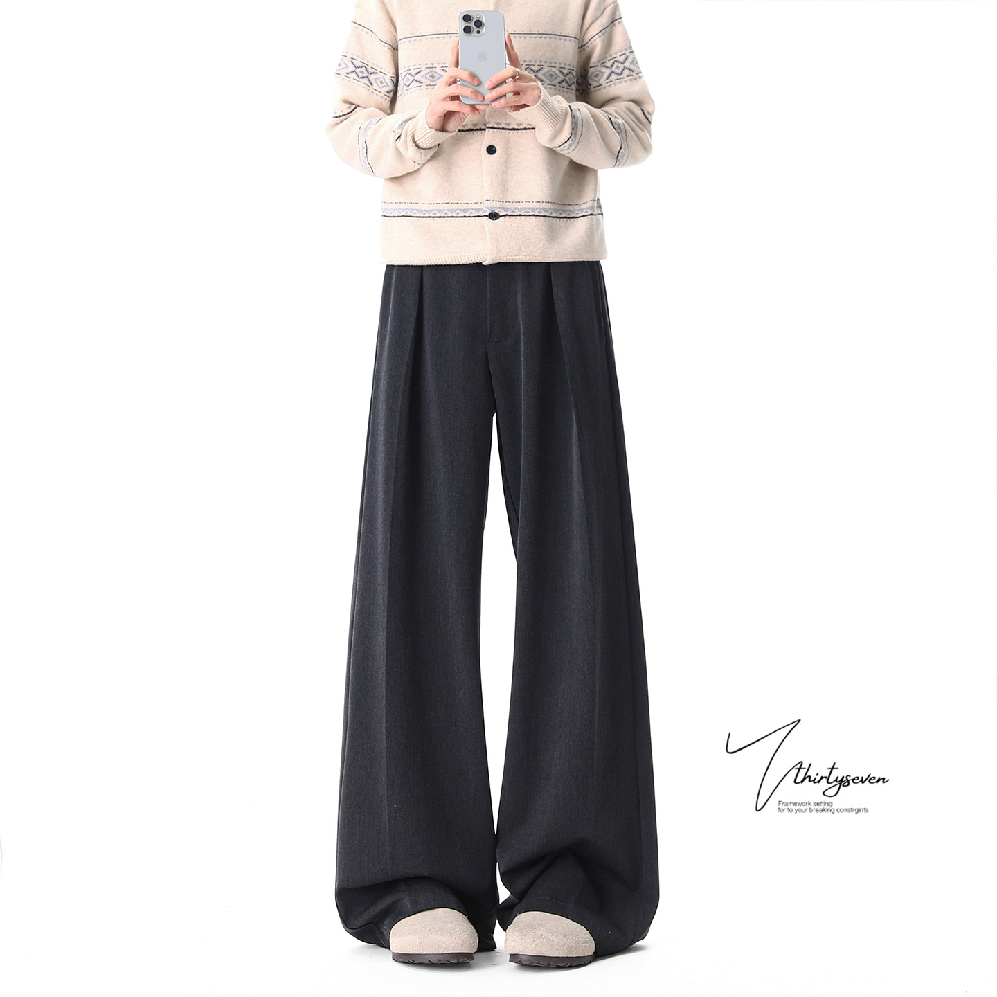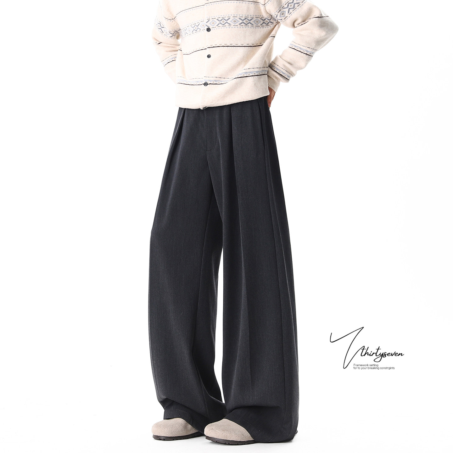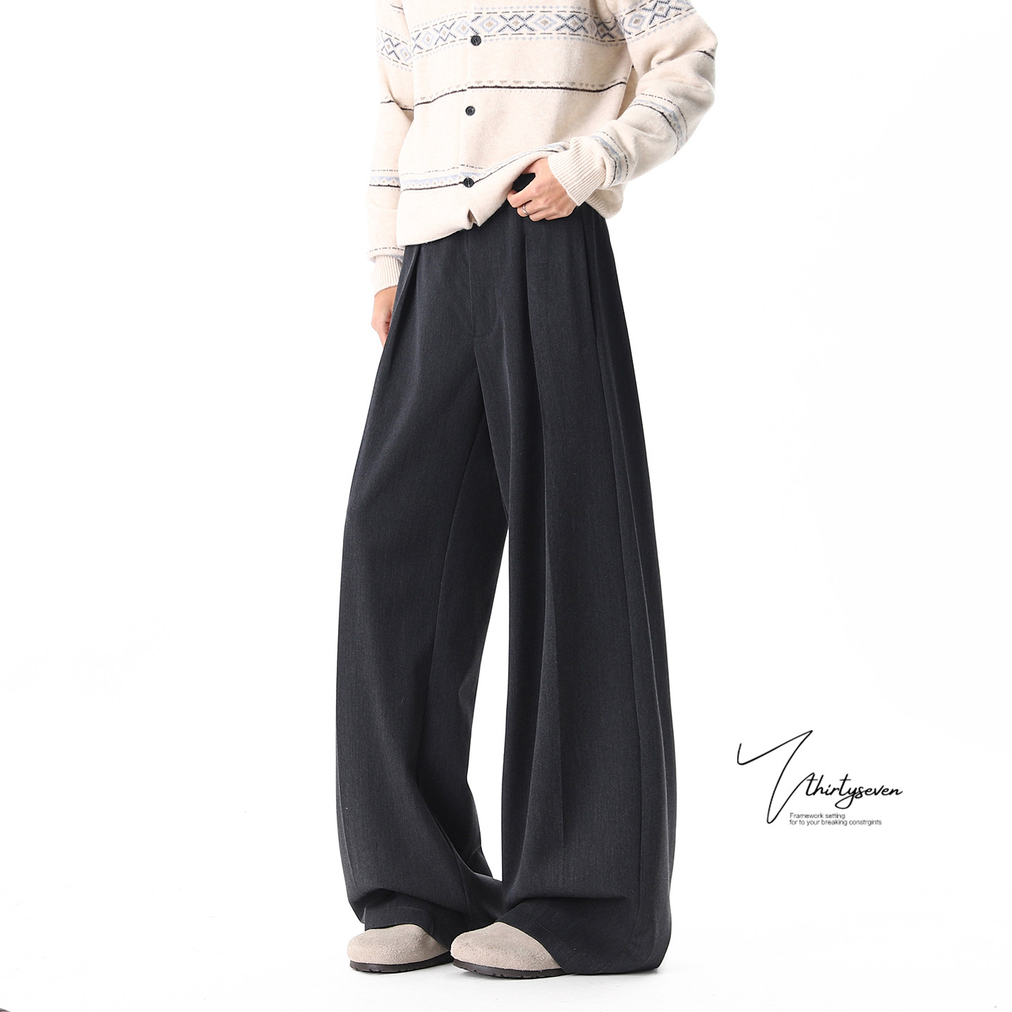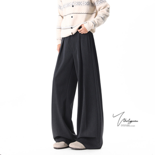 AFM定制 宽松灰色休闲长裤 叠褶腰贴西裤 女初春百搭阔腿垂感拖地裤