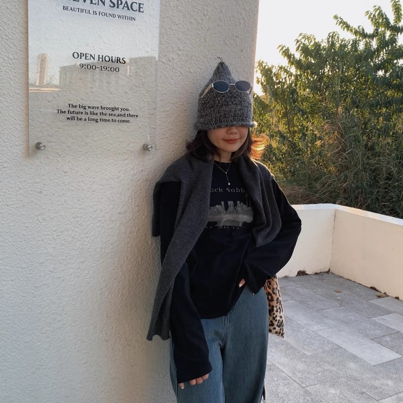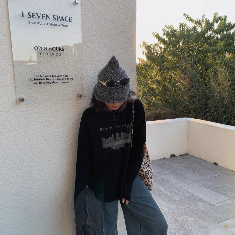 上衣女 复古印花圆领宽松慵懒软糯内搭T恤打底衫 one seven秋冬美式