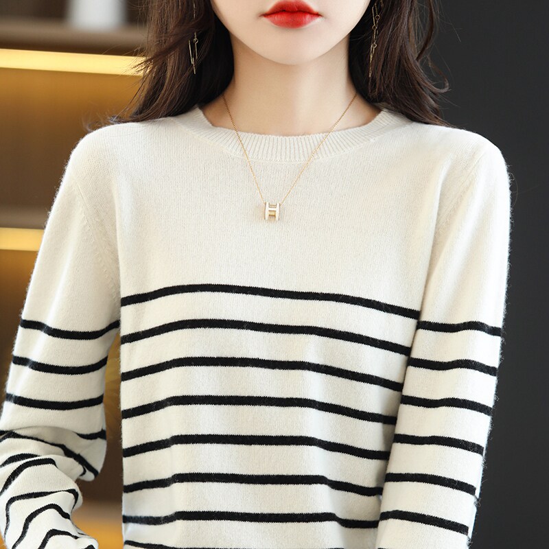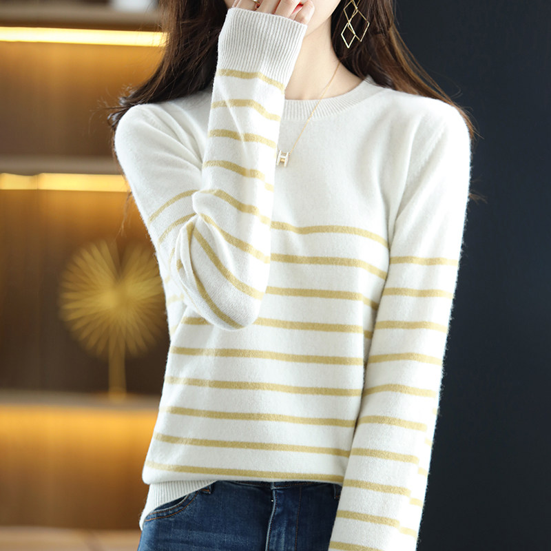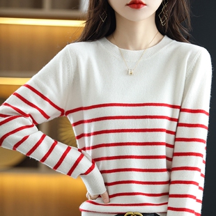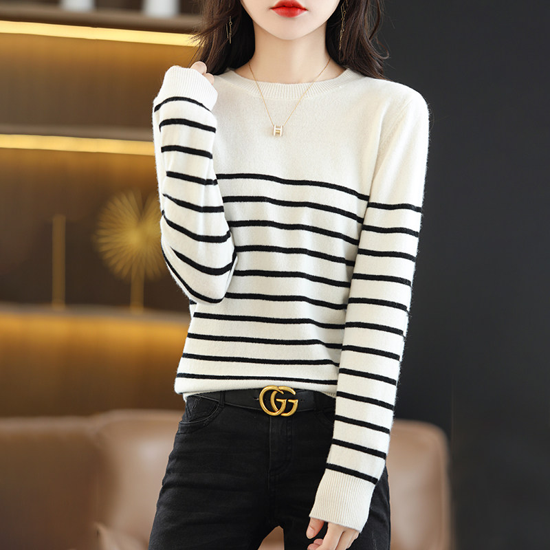 简约质感穿搭单品 百搭 CB2558秋冬女100%羊毛条纹圆领针织衫 经典
