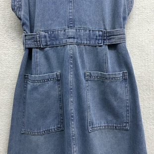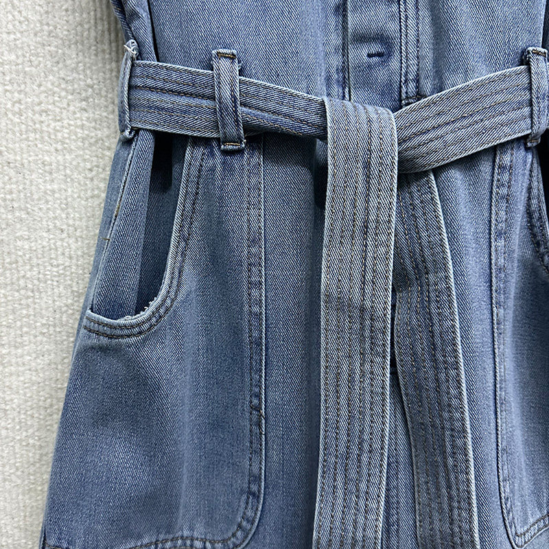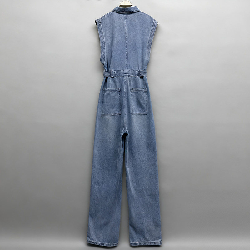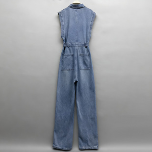 单排扣直筒牛仔连体裤 百搭磨白无袖 新款 外贸原单175高个子女装