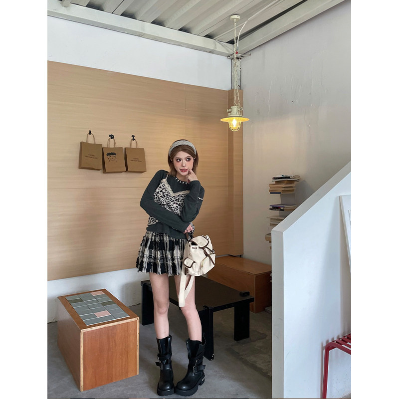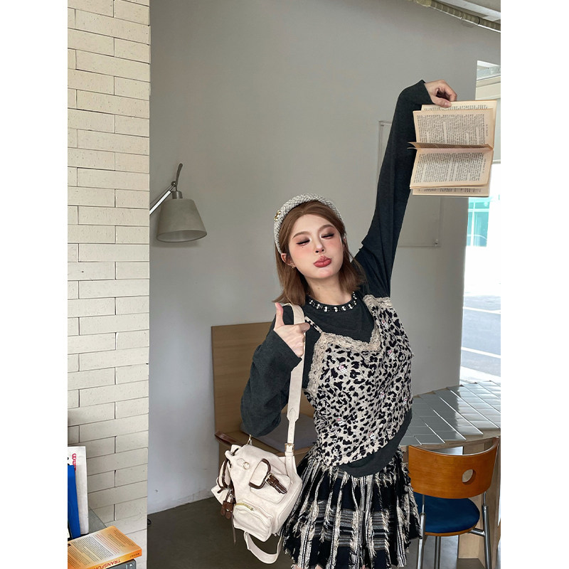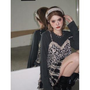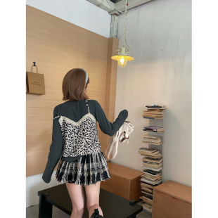 上衣 长袖 skipsmile秋冬新款 甜辣风豹纹蕾丝拼接假两件钉珠短款