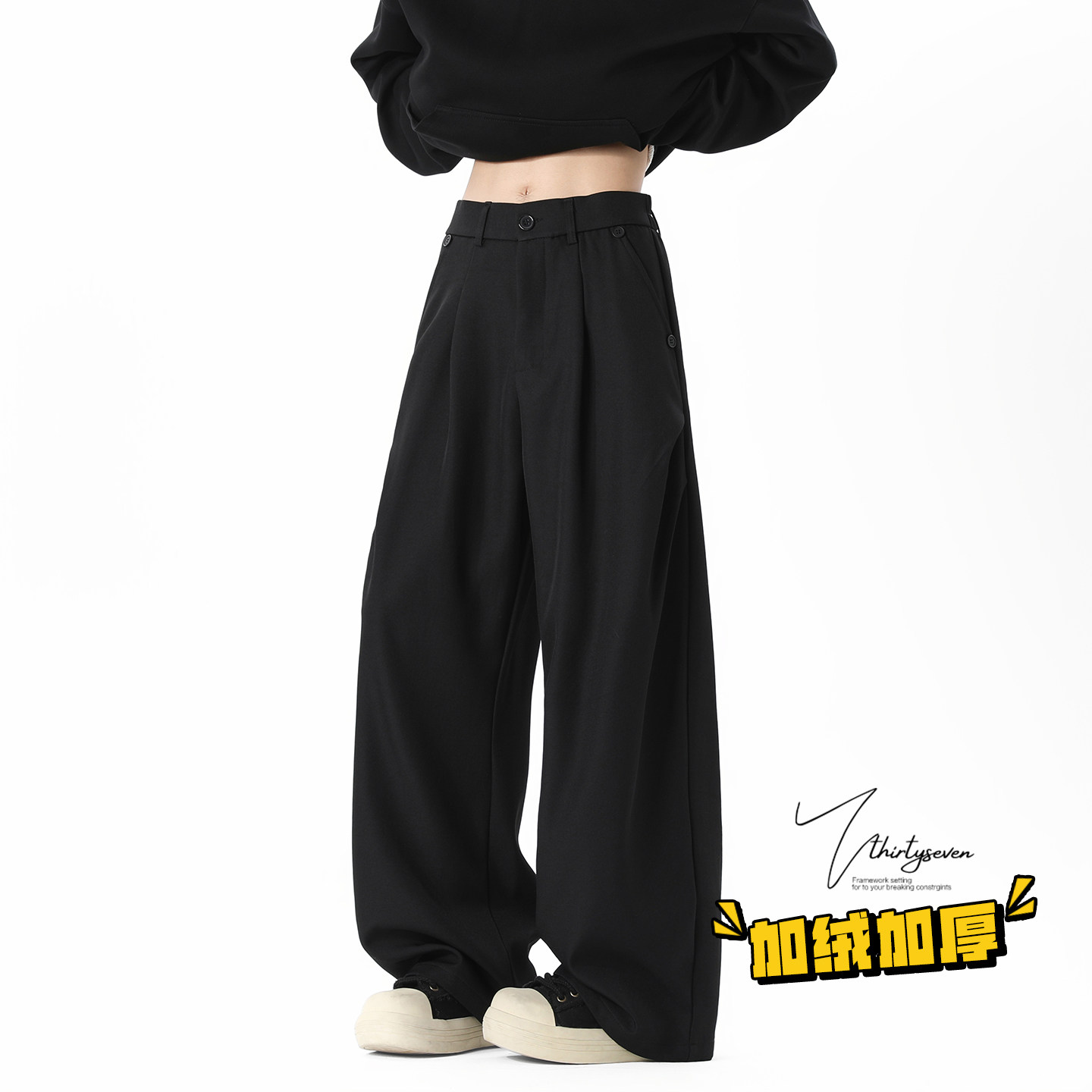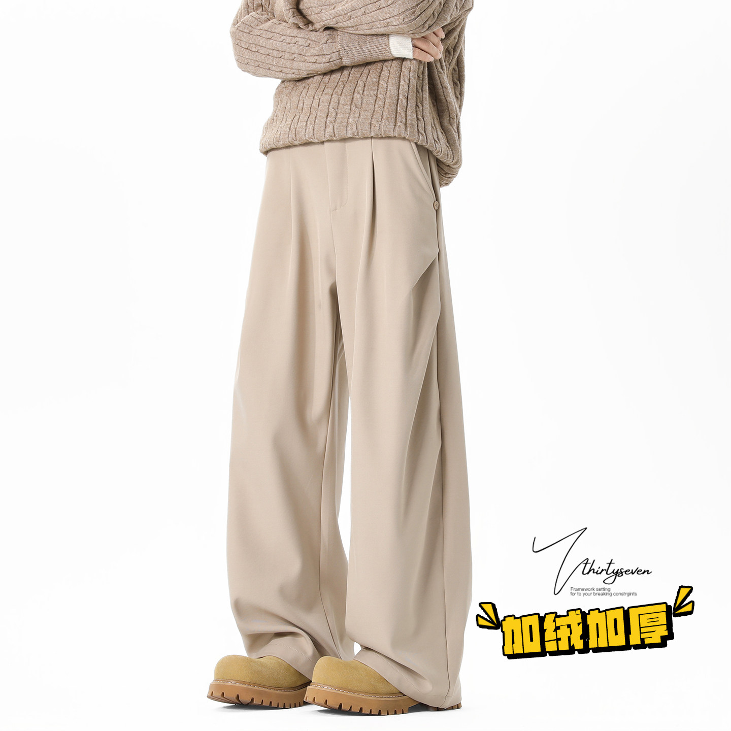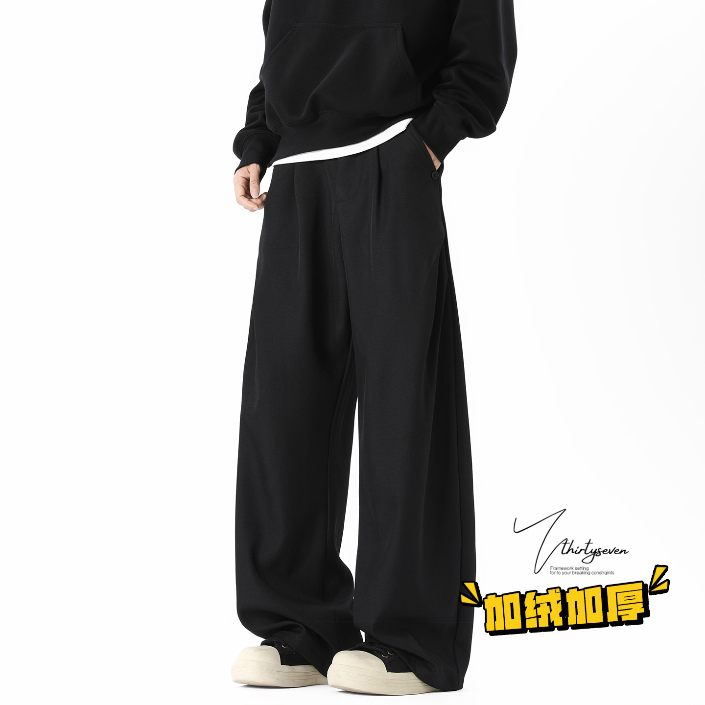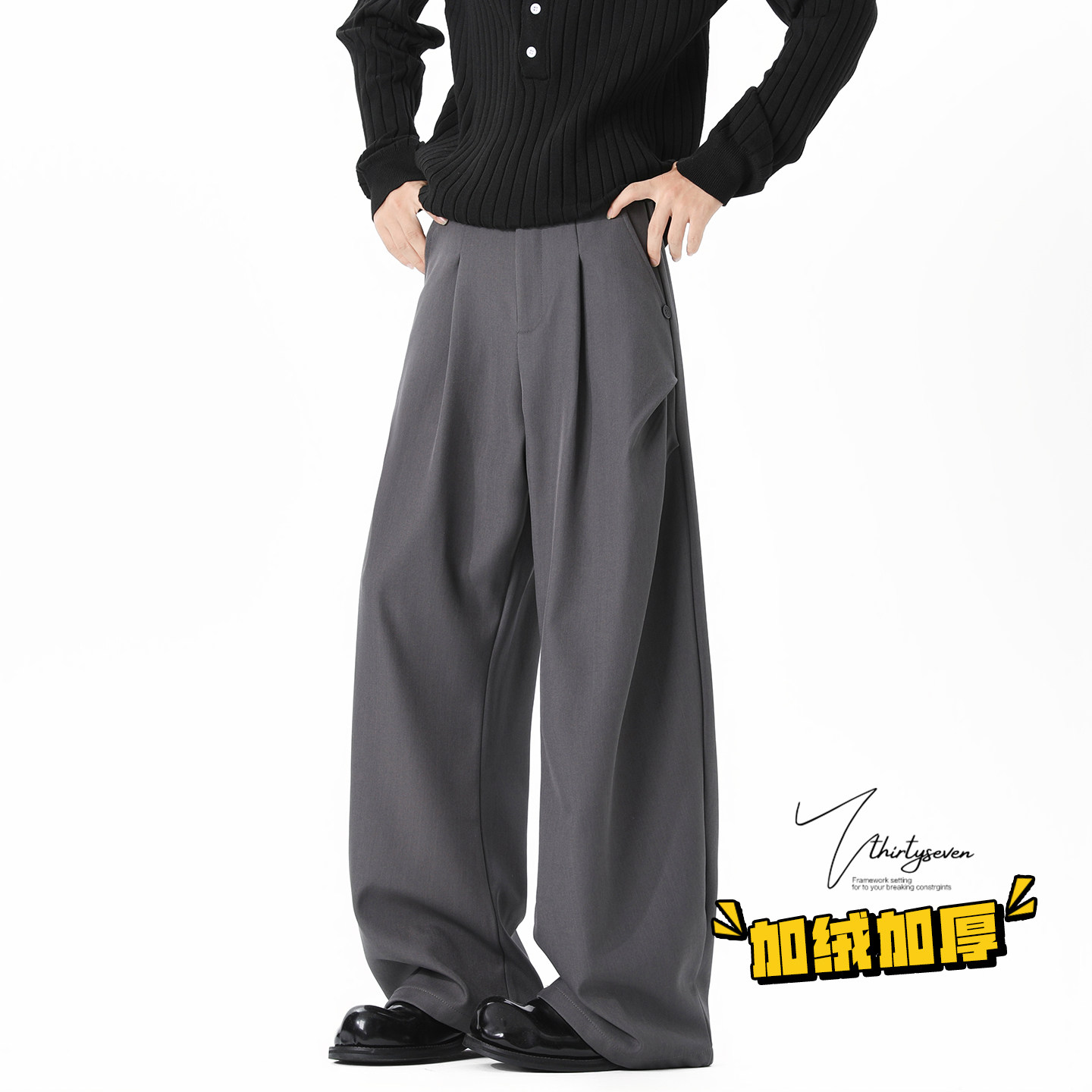 加绒加厚垂感阔腿长裤 男冬季 老钱风深灰色褶皱宽松休闲裤 V37美式